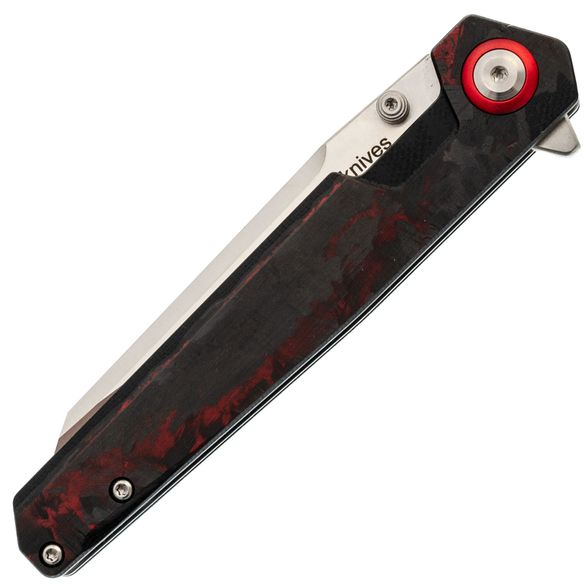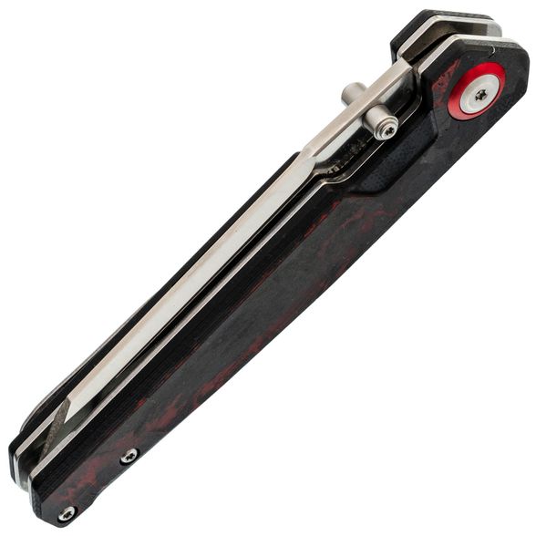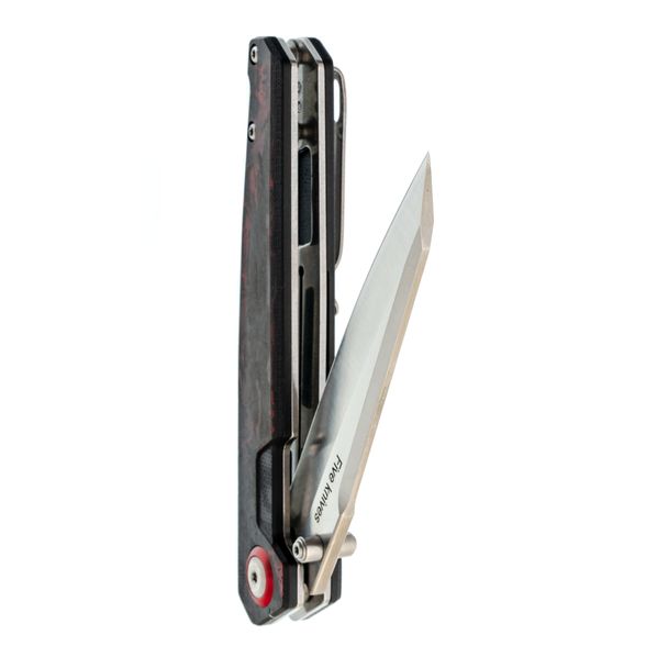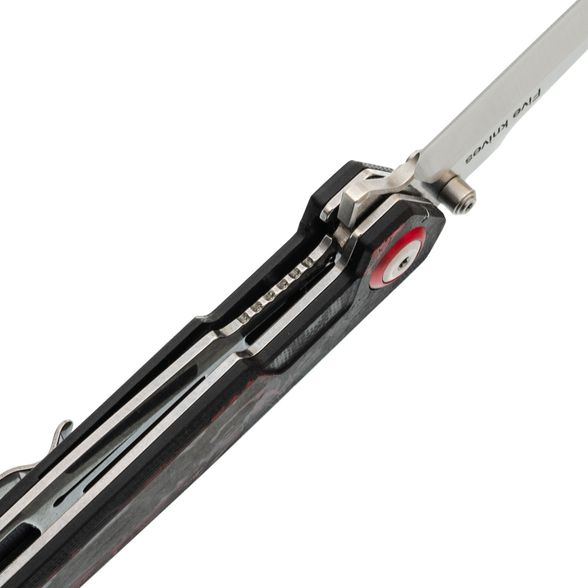 Рукоять Five Knives 17 имеет узкую форму и глубокую подпальцевую выемку, обеспечивая надежный и комфортный хват. Накладки выполнены из черного карбона с красными прожилками - это прочный и легкий материал, устойчивый к влаге, перепадам температур и ударным нагрузкам. Карбон придает ножу не только функциональность, но и уникальный внешний вид. Каждая композиция красных прожилок на черном фоне уникальна, делая ваш нож по-настоящему особенным.