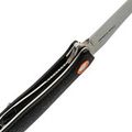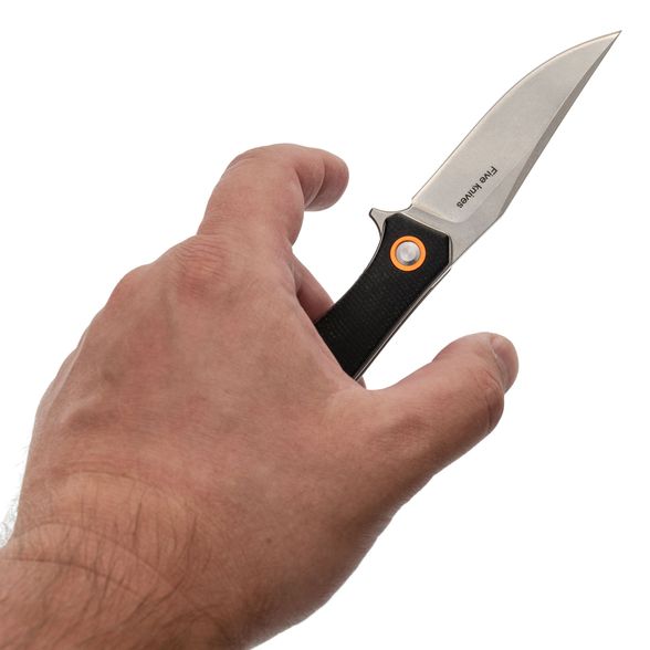 Клинок ножа изготовлен из высококачественной стали D2, которая обеспечивает длительное сохранение заточки и агрессивный рез. Форма Straight Clip-Point не только придает ножу брутальный внешний вид, но и обеспечивает высокую проникающую способность, делая его универсальным инструментом для различных задач. Плавник клинка формирует надежный подпальцевый упор, повышая контроль и безопасность при использовании.
