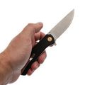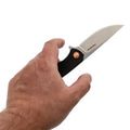 Рукоять ножа имеет нейтральную форму, благодаря чему удобно ложится в руку любого размера. Накладки выполнены из микарты - прочного и надежного материала, который может использоваться в любых условиях. Микарта со временем использования приобретает уникальный, потертый внешний вид, отражая историю приключений вашего ножа.