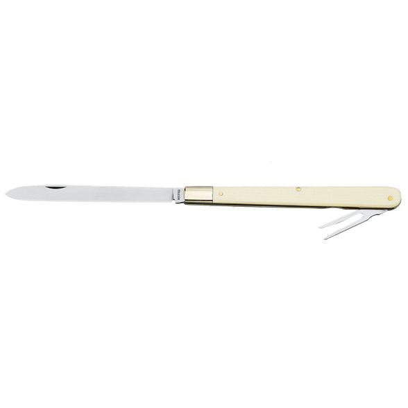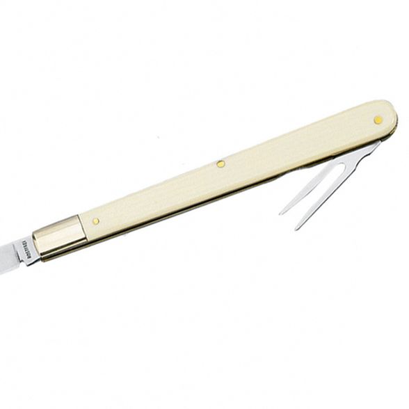 Складной нож Fox Camping отлично подойдет для походов, пикников и другого досуга на свежем воздухе. Клинок выполнен из нержавеющей стали марки 420C с гладкой кромкой и профилем Drop Point. Для его раскрытия используется небольшая выемка в обуховой части. Рукоять изготовлена из пластика Elforyn, имитирующего текстуру слоновой кости. При этом данный материал устойчив к выгоранию и ударным нагрузкам. Помимо ножа, Fox Camping укомплектован двузубчатой раскладной вилкой, расположенной в тыльной части рукояти. Складной походный нож вилка станет отличным презентом для рыбака, охотника, туриста или дачника.