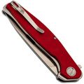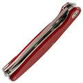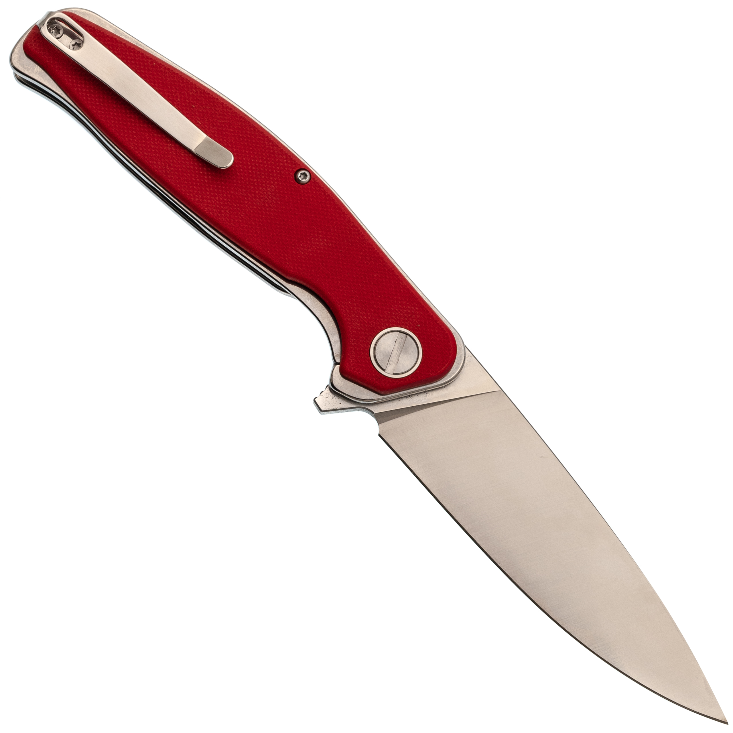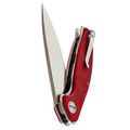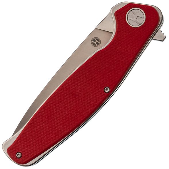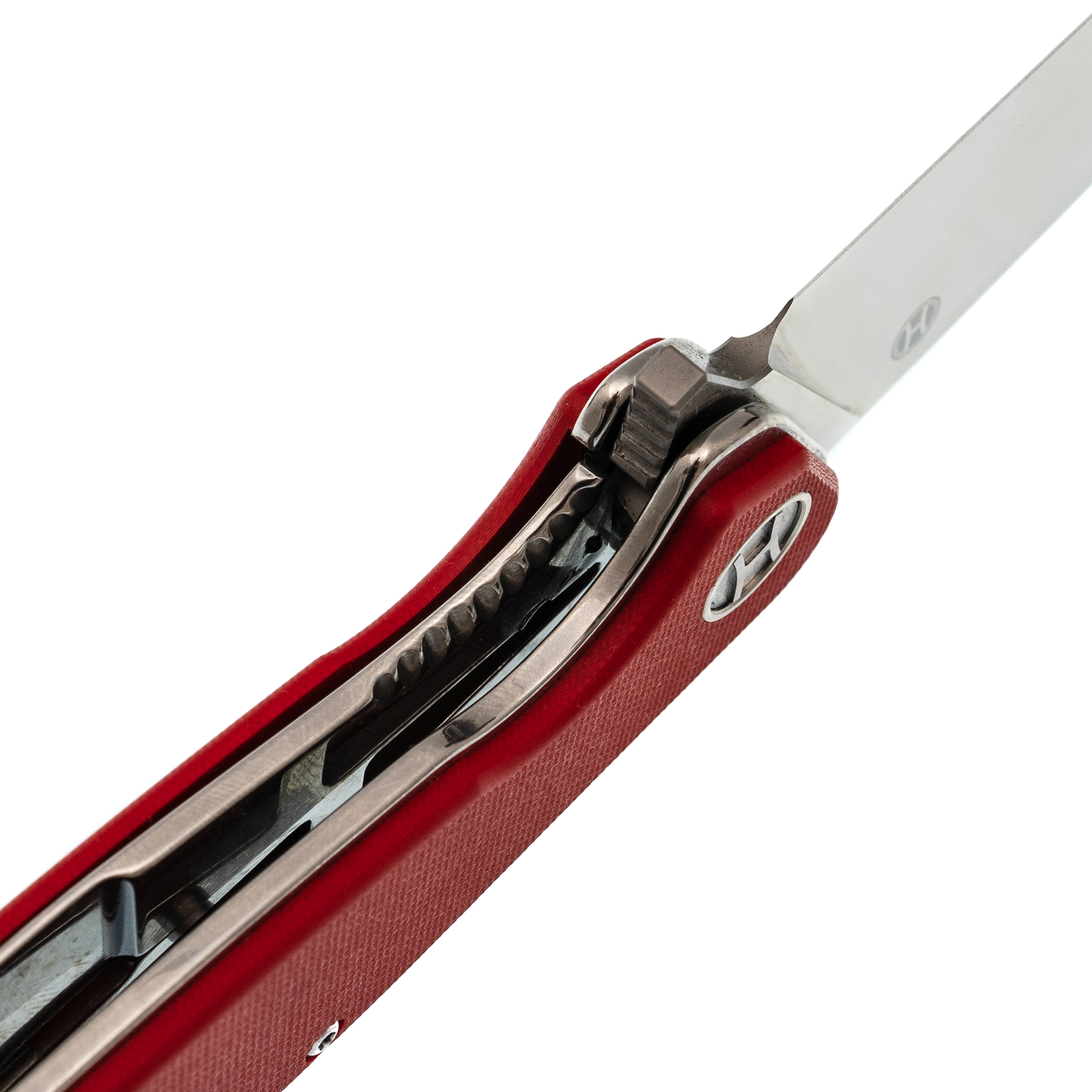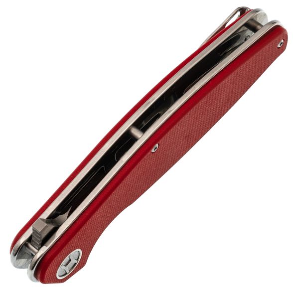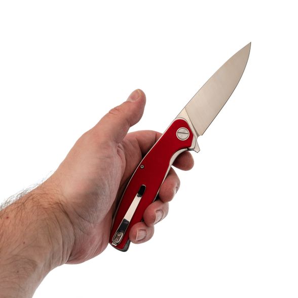 Рукоять имеет изогнутый профиль без агрессивных вырезов под пальцы. Это сделано намеренно: такая форма одинаково удобна и в молоточном хвате, и в пистолетном, и в перчатке. Общая толщина конструкции хорошо заполняет руку, что удобно при продолжительной работе. Лайнеры из нержавейки толщиной 2 мм - это запас жёсткости всей конструкции. Один из лайнеров работает как замок Liner-Lock: большая толщина означает увеличенную площадь контакта клинка с замком и более высокий ресурс выработки и прочность. Открывается нож за плавник, и здесь стоят стальные подшипники. Их плюс в том, что они менее чувствительны к пыли и мелкому мусору, чем керамика, а срок службы в жестких условиях выше. Клинок вылетает чётко, без заеданий, одной рукой - хоть правой, хоть левой. Карманная клипса позволяет носить нож глубоко: в кармане торчит только небольшая часть рукояти, нож не выпадает при беге или наклонах.
