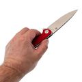 Длина в 10 см - это не случайная цифра. На ней заканчиваются компромиссы: нож уже достаточно длинный, чтобы пластом нарезать мясо или разрубить кусок каната одним движением, но ещё не настолько громоздкий, чтобы его было неудобно носить в боковом кармане джинсов. Форма Spear-Point даёт умеренное брюшко - при протяжном резе лезвие не уходит вверх, а идёт по материалу плавно. Кончик при этом остаётся острым и прочным: им удобно подцеплять упаковку, делать стартовый надрез или выбирать сердцевину у овощей. Прямые спуски от обуха - это про отличные режущие свойства - клинок входит в материал плавно. Толщина в 4 мм делает клинок устойчивым к нагрузкам, если приходится поддевать что-то или работать с плотными материалами.