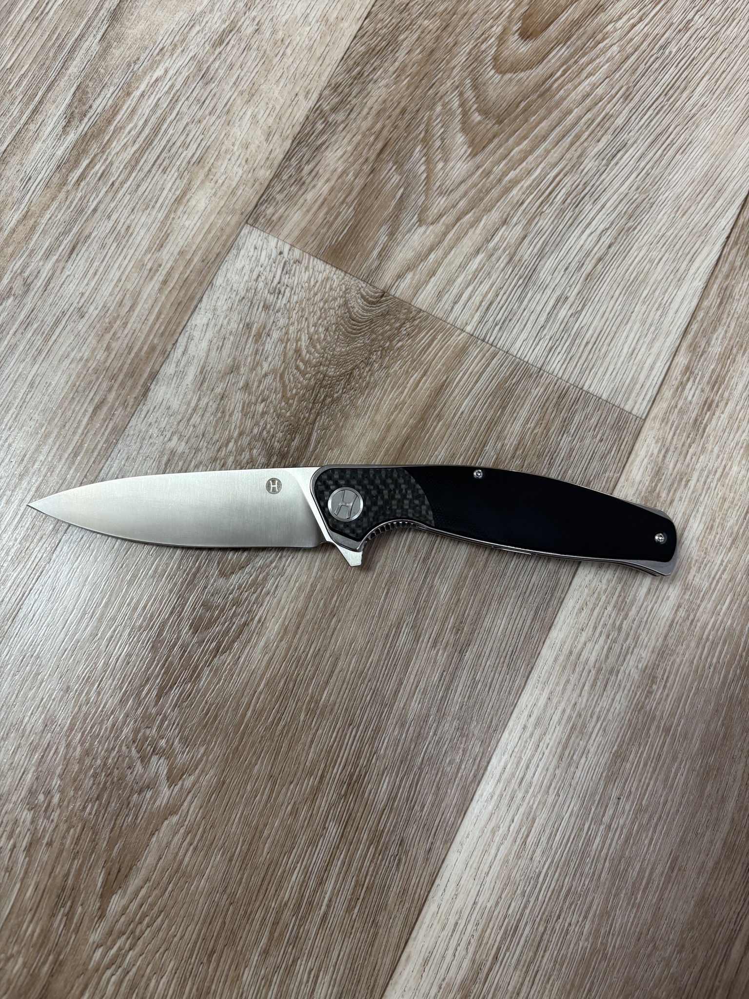 Клинок ножа изготовлен из премиальной стали M390, которую можно назвать королевской сталью благодаря её популярности на элитных ножах. Этот порошковый сплав обладает превосходной коррозионной стойкостью и долгим удержанием заточки, обеспечивая высокую производительность в самых разнообразных условиях. Геометрия клинка универсальна: форма Spear-Point с прямыми спусками от обуха толщиной 4 мм придаёт ему оптимальную прочность и хорошие режущие свойства. Открытие клинка осуществляется плавно и быстро благодаря наличию флиппера и керамических подшипников в осевом узле.