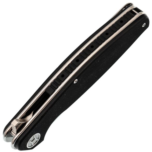 Рукоять выполнена с плавным изгибом без агрессивных подпальцевых выемок: она одинаково удобна в любом хвате. Внутри - стальные лайнеры толщиной 2 мм, обеспечивающие жёсткость всей конструкции. Почти на всю длину спинки рукояти установлен спейсер из того же материала, что и накладки. Он стягивает обе стороны рукояти, исключает люфт при боковых нагрузках и заметно увеличивает общую прочность. Один из лайнеров работает как замок Liner-Lock: большая толщина даёт увеличенную площадь контакта с пяткой клинка и долгий ресурс без выработки. Открывается нож за плавник на керамических подшипниках - они не боятся коррозии, работают тише и плавнее стальных, а ресурс работы в осевом узле при аккуратном обращении практически неограничен. Карманная клипса позволяет носить нож глубоко в кармане: на виду остаётся только небольшая часть рукояти, а сам Ajax не выпадает даже при активном движении.