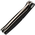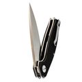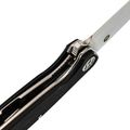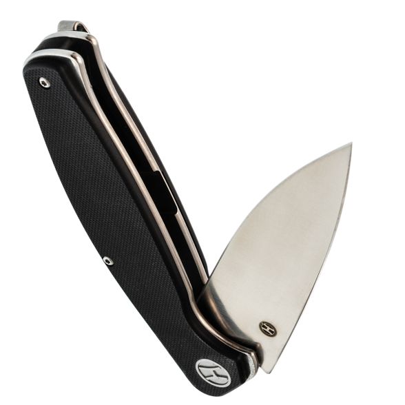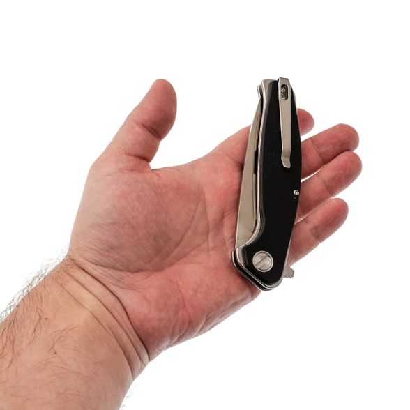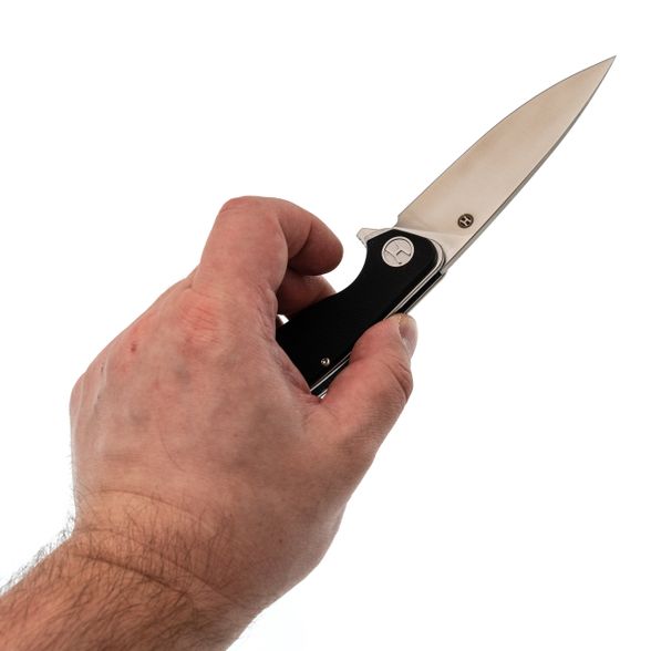 Длина 10 см - это сознательный выбор между маневренностью и возможностью справиться с крупной задачей. Форма Spear-Point даёт изогнутую режущую кромку, которая отлично работает в протяжных резах: хоть разделка мяса, хоть нарезка хлеба - нож идёт плавно, без рывков. Выраженный кончик при этом остаётся достаточно прочным для точечных работ: надрезать стропу, снять кору с колышка или аккуратно поддеть крышку консервной банки. Прямые спуски от обуха делают геометрию простой и понятной - клинок входит в материал с минимальным усилием, а править его легко даже на подручных абразивах. Толщина в 4 мм даёт запас прочности, который позволяет не оглядываться на то, что в руках складной нож.