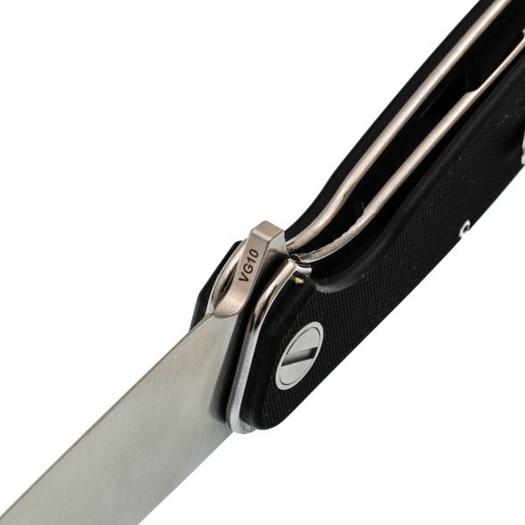 - Клинок VG-10: японская сталь с репутацией рабочей лошадки премиум‑сегмента. Кобальт и ванадий в составе дают мелкозернистую структуру, которая держит агрессивную остроту дольше обычных нержавеек. При этом сталь не крошится на тонких углах заточки. Коррозионной стойкости хватает, чтобы не переживать после контакта с фруктами или мокрой одеждой.