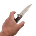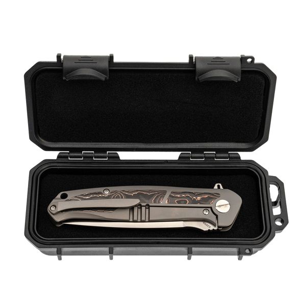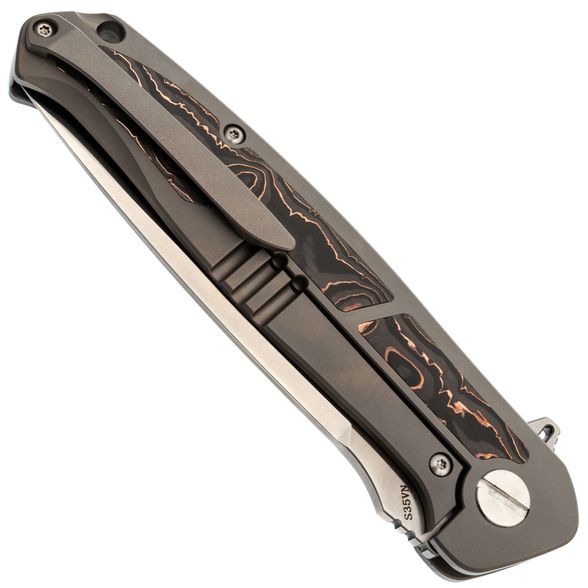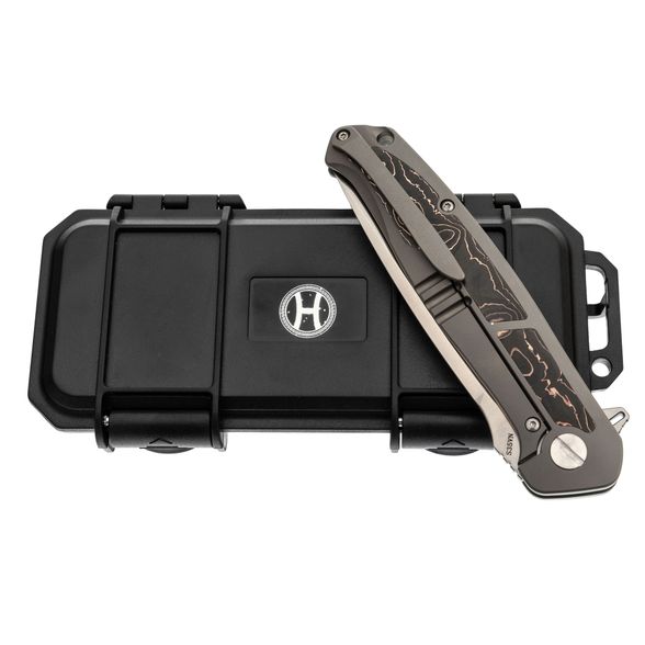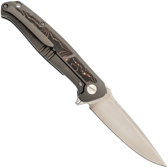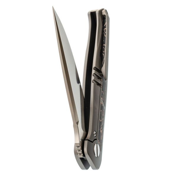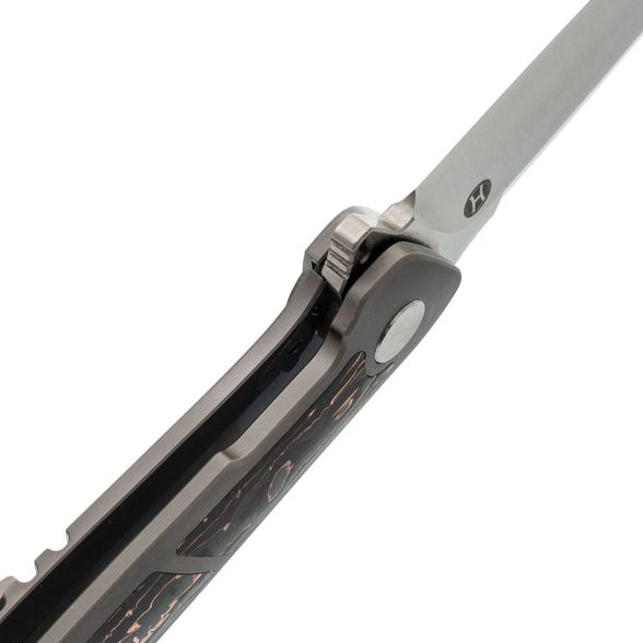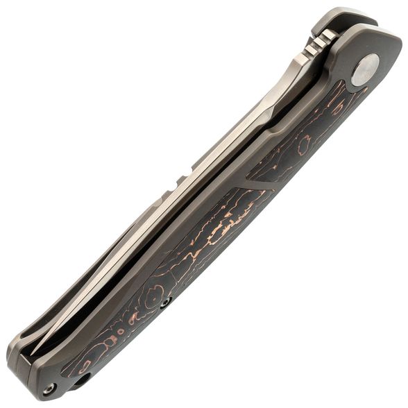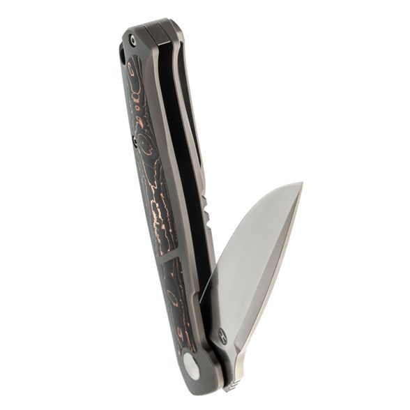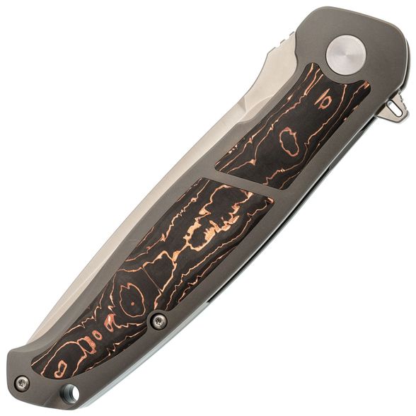 Рукоять ножа изготовлена из прочного титана, который обеспечивает невероятную легкость и долговечность. Этот премиальный материал делает нож не только функциональным, но и изысканным аксессуаром. Вставки из карбона с медными прожилками добавляют рукояти уникальности и подчеркивают ее высокий класс. Кажущийся узким профиль ножа обеспечивает оптимальный баланс между элегантностью и режущими характеристиками. Нейтральная форма рукояти идеально подходит для любого размера руки, обеспечивая комфорт во время использования.
