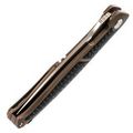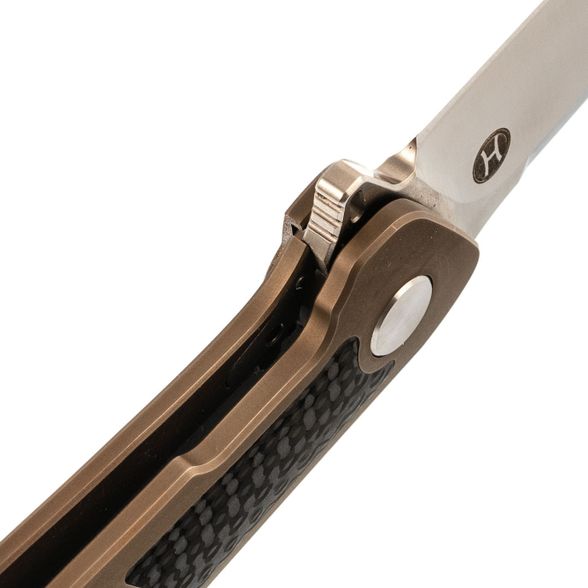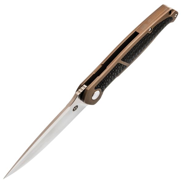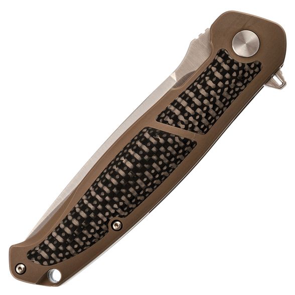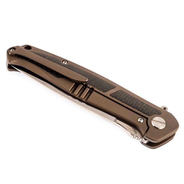 Длина ножа в сложенном положении составляет 130 миллиметров, что обеспечивает комфортный хват даже для большой руки. Рукоять имеет небольшой изгиб, благодаря которому она идеально ложится в руку, повторяя контуры ладони. Титановый сплав рукояти анодирован в цвет состаренной бронзы, символизируя сочетание классической геометрии и инновационных технологий.