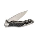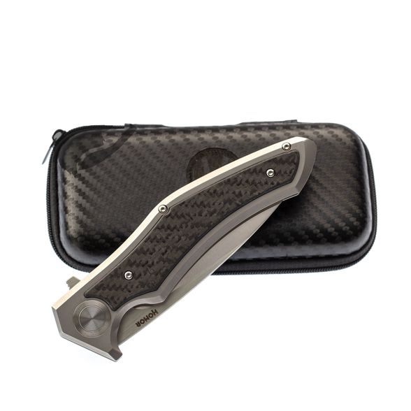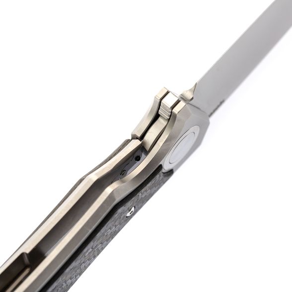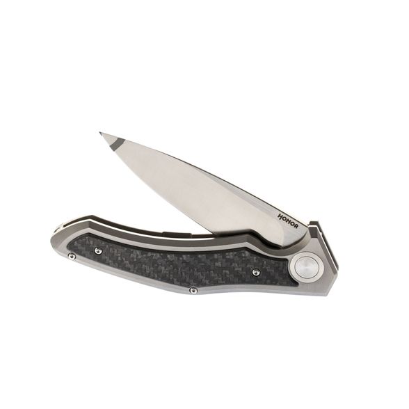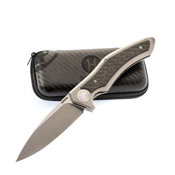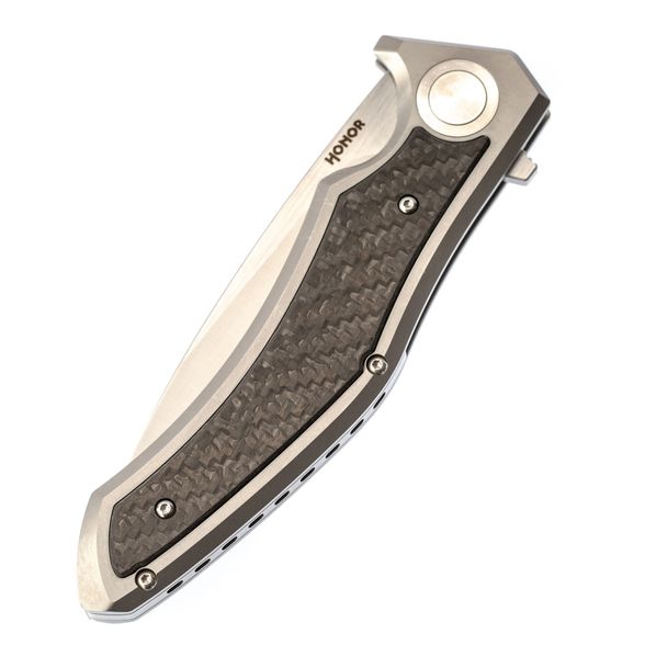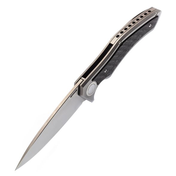 СКЛАДНОЙ НОЖ HONOR CONAN, СТАЛЬ S35VN, РУКОЯТЬ ТИТАН И КАРБОН это модель для ценителей высокого функционала и легкого изящества в дизайнерских решениях. Геометрия клинка выполнена в классической стилистике - это традиционный симметричный "лепесток", который был популярен в середине прошлого столетия. Однако, здесь используются высокие спуски и максимально тонкий подвод, что обеспечивает уверенный и хорошо контролируемый рез. Твердая порошковая сталь сохраняет остроту достаточно долго, так что при выполнении несложной работы (работа по продуктам, вскрытие упаковок), вы сможете забыть о заточке. Титановая рукоятка дополнительно украшена накладками из карбонового волокна.