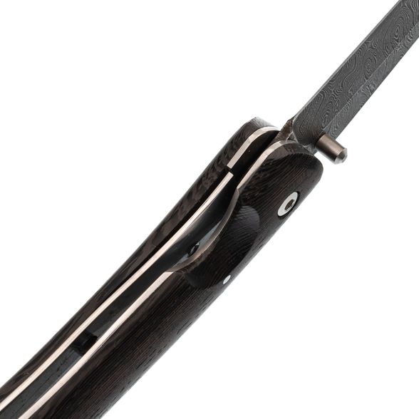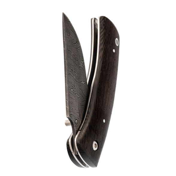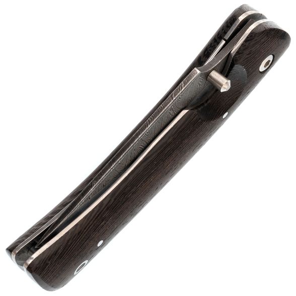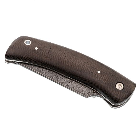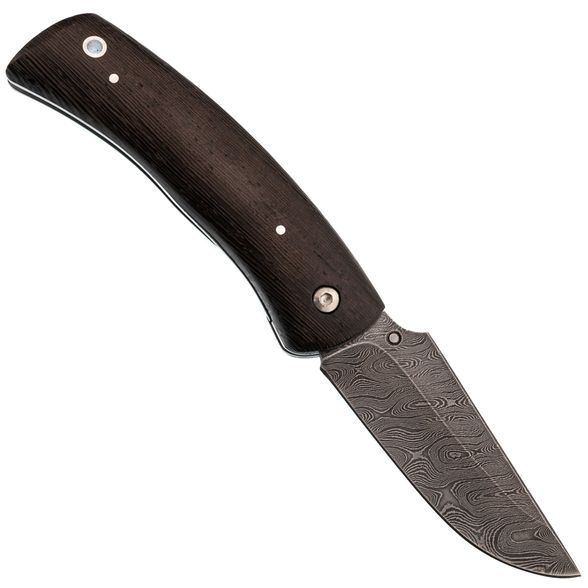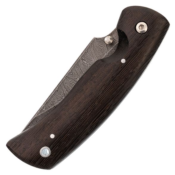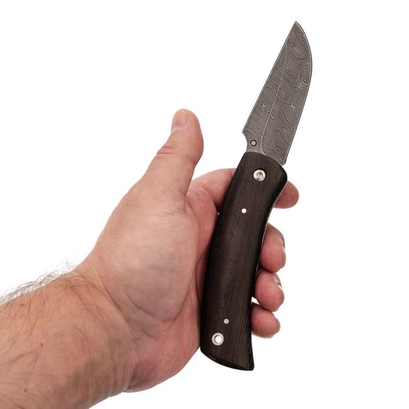 Универсальный складной нож из дамаска "Аляска" выполнен в традиционной для северо-американских ножей манере. Клинок из дамасской стали повторяет геометрию ножей первых поселенцев. Каждому охотнику был нужен универсальный складной нож, который можно было использовать для приготовления пищи или разделки добычи, поэтому такая геометрия проверена временем и оптимальная для любых задач.