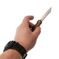 Нож относится к категории Friction Folder, то есть не имеет замка. В открытом положении клинок удерживается рукой, что обеспечивает достаточный уровень надёжности для повседневного использования, оставаясь при этом простым и безопасным инструментом.
