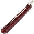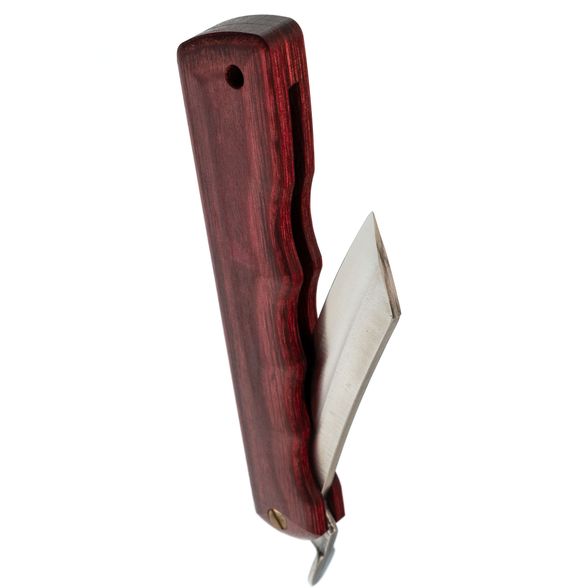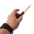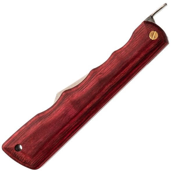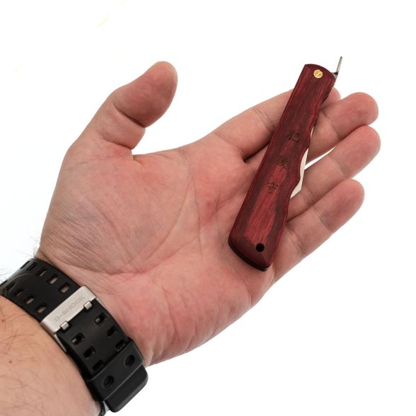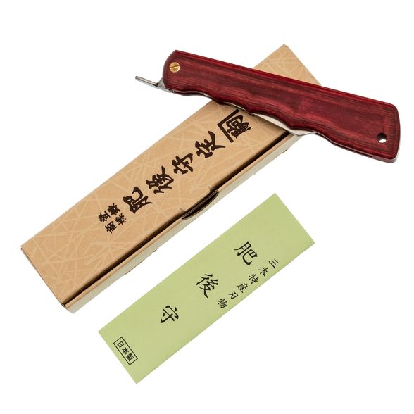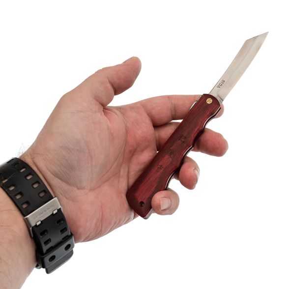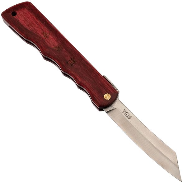 Рукоять ножа выполнена из стабилизированной древесины красного ореха. Этот материал не только придаёт рукояти изысканный вид, но и делает её водостойкой и удобной в использовании. Красный цвет в японской культуре имеет глубокое символическое значение — он ассоциируется с жизненной энергией, силой и удачей, что добавляет ножу особую ценность и характер.