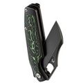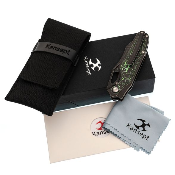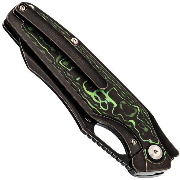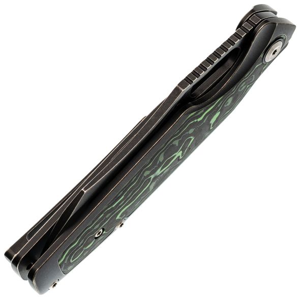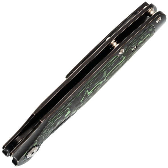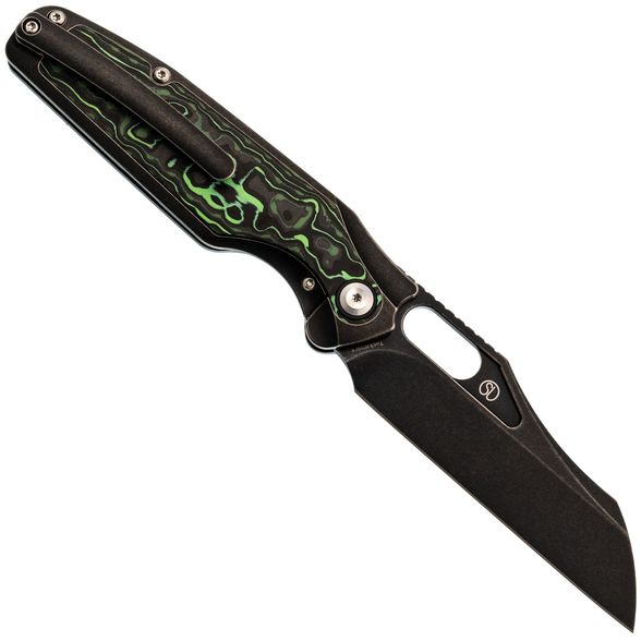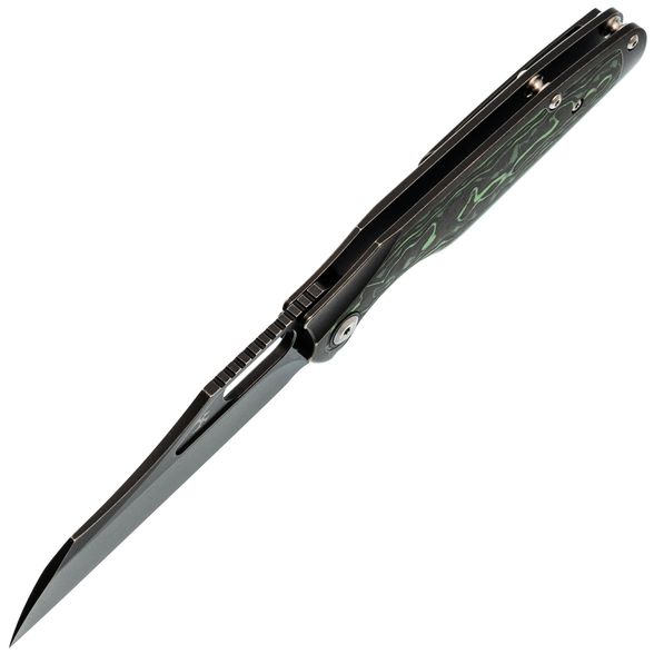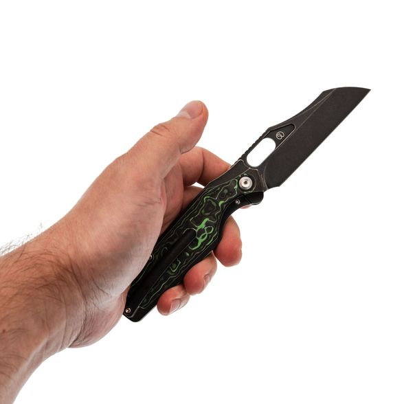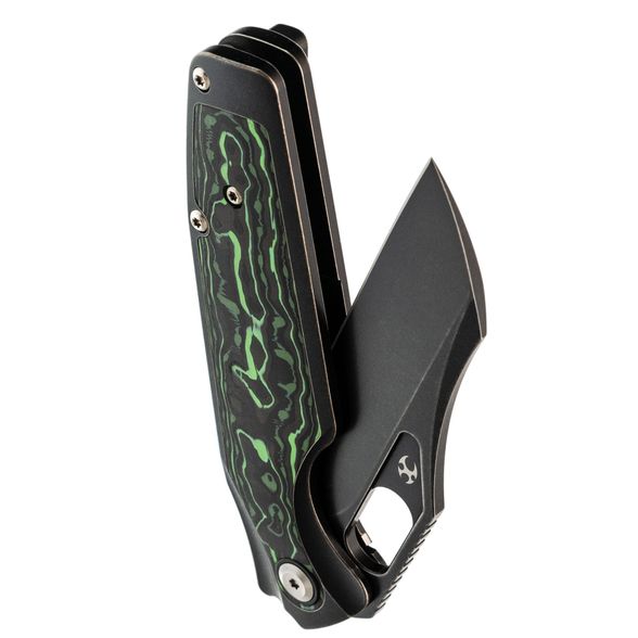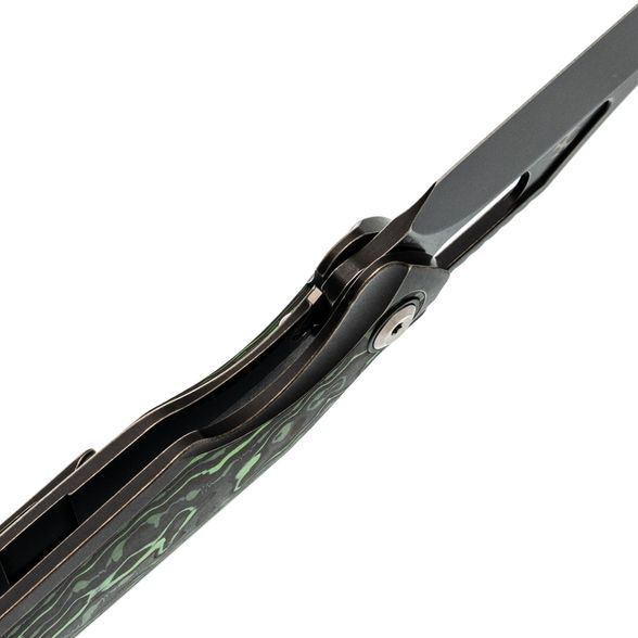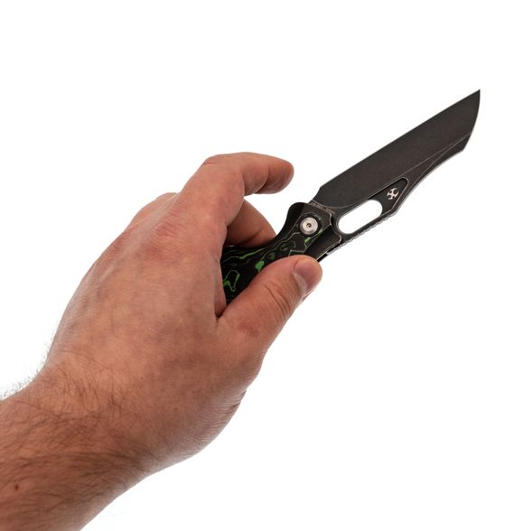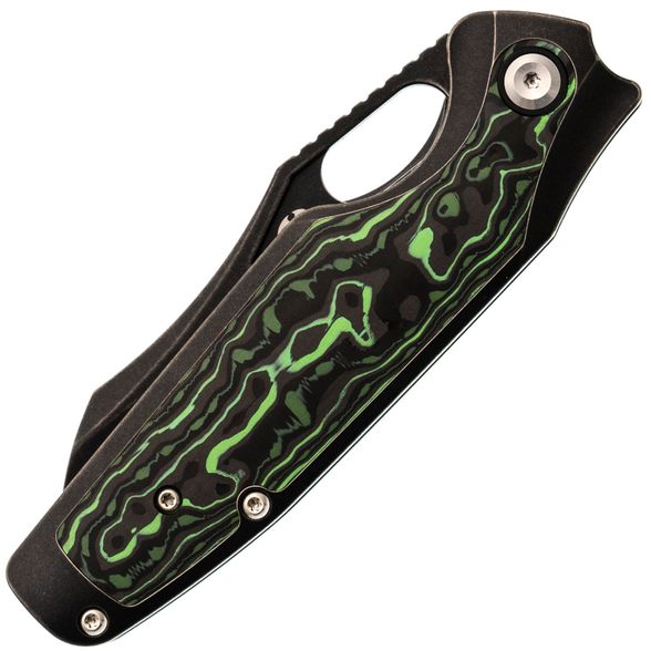 Рукоять Tuckamore разработана с акцентом на эргономику. С одной стороны - строгий чёрный титан, с другой - выразительный карбон с черно-зелёным рисунком. Такая комбинация не только эстетична, но и способствует надёжному и комфортному удержанию ножа в руке.