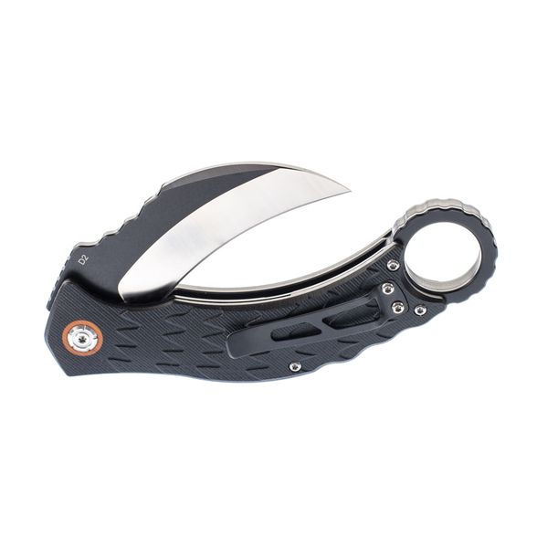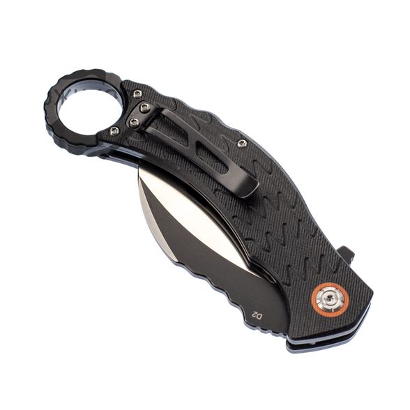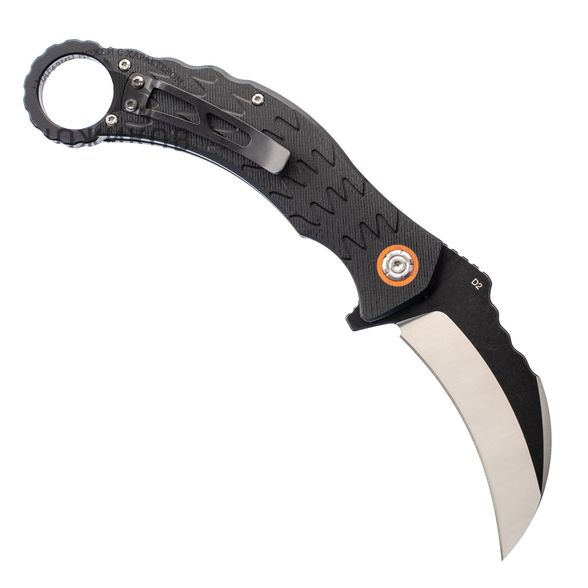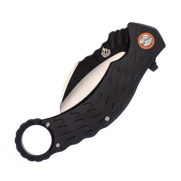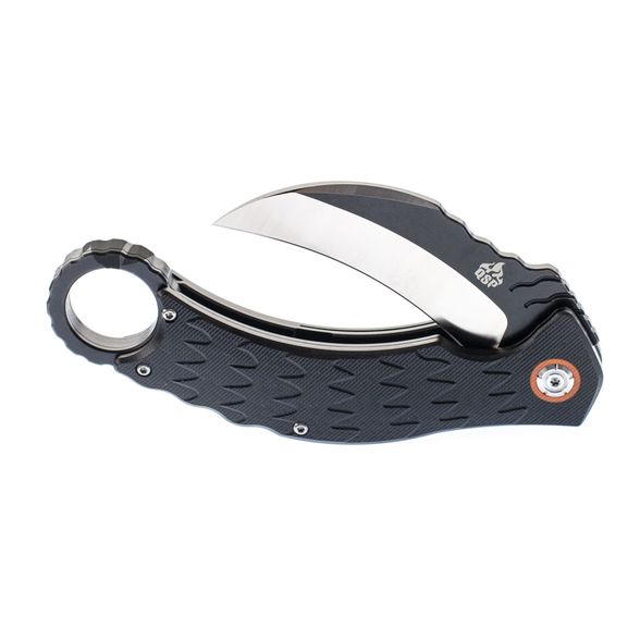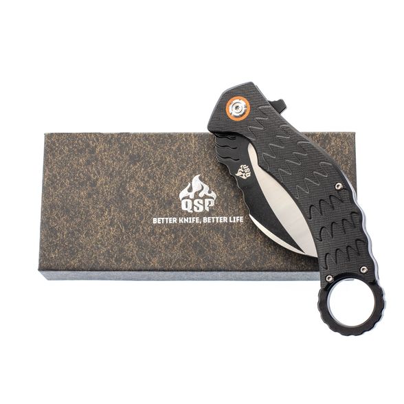 QS120-B Складной нож керамбит Eagle Black, сталь D2, рукоять G10 выполнен из современных материалов и по своему целевому назначению является достаточно универсальным ножом для ежедневного использования. Одной из фишек ножей с такой геометрией является возможность выполнения силового реза при расположении ножа "от себя". Такая особенность может пригодиться, когда нужно перерезать кабель или толстую синтетическую веревку, разрезать ремень безопасности или садовый шланг. Нож также пригодится в экстремальной ситуации - благодаря наличию кольца он уверенно фиксируется любым хватом и его практически невозможно выбить из руки.