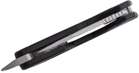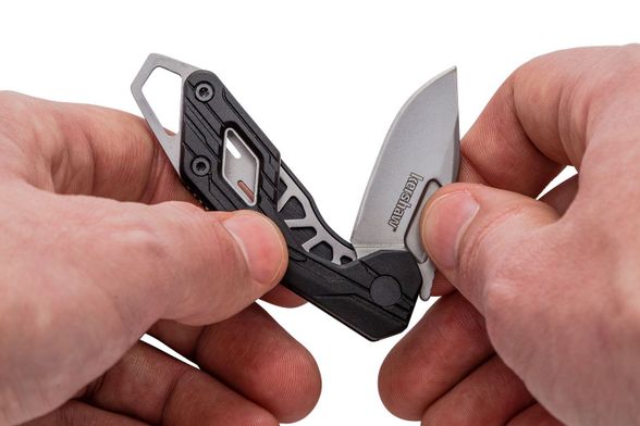 Особенность конструкции - увеличенное отверстие в бэкспейсере, которое не только упрощает крепление ножа к ключам или карабину, но и выполняет функцию плоской отвёртки. Лезвие открывается вручную с помощью специального выреза на клинке - простое и надёжное решение без лишней механики.