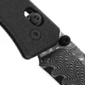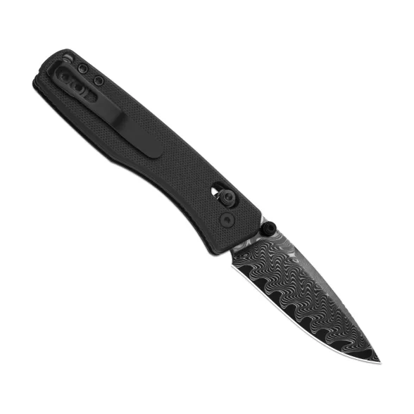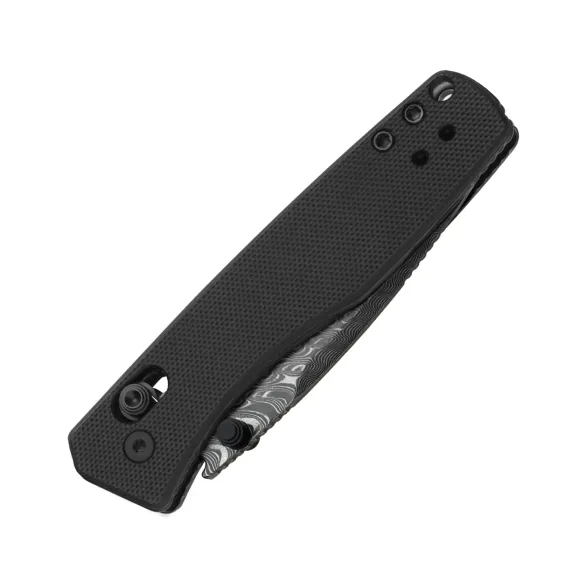 Drop-Point с высокими прямыми спусками - универсальная геометрия: ровный рез и хороший контроль на точных работах. У дамаска упор на фактуру и рисунок, поэтому покрытие здесь не требуется. Двусторонние шпеньки делают открывание одинаково удобным для правшей и левшей.