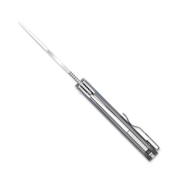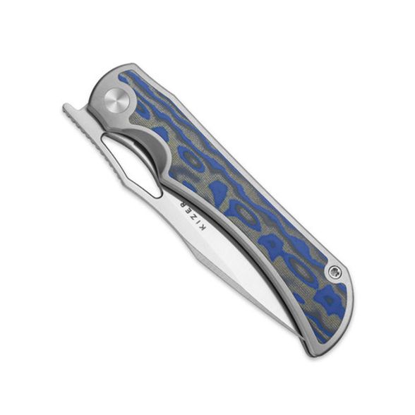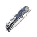 Рукоять сочетает титановые элементы и накладки из микарты с узорчатым синим оформлением, создавая современный и выразительный дизайн. Эргономичная форма обеспечивает уверенный и удобный захват, позволяя инструменту комфортно лежать в руке даже при длительном использовании. Замок Liner-lock гарантирует стабильность фиксации клинка и уверенность в работе.