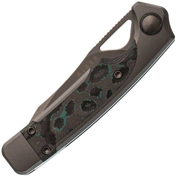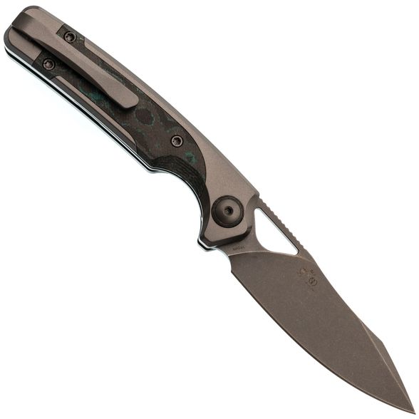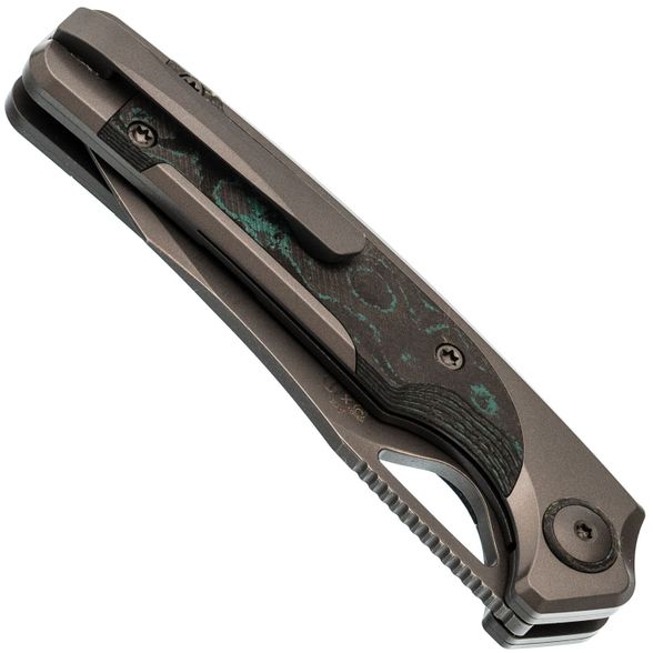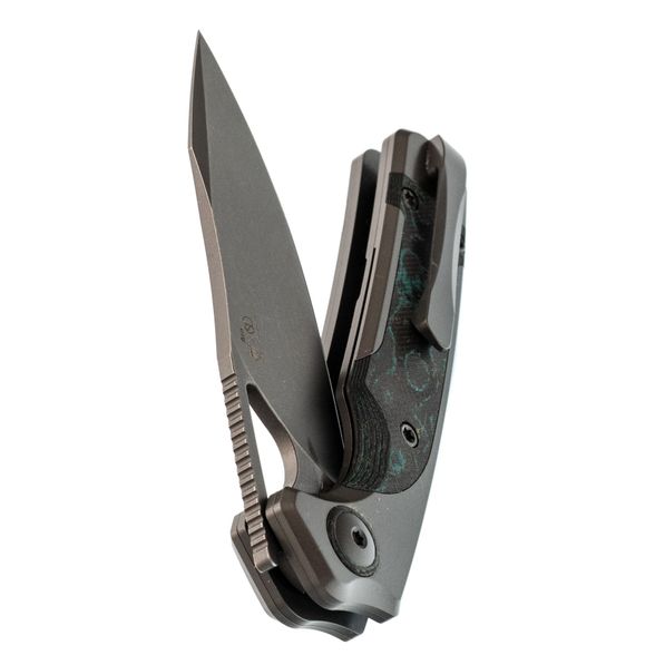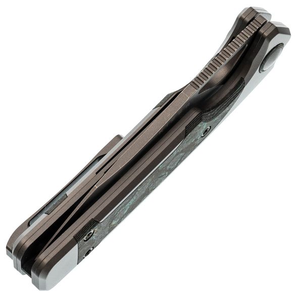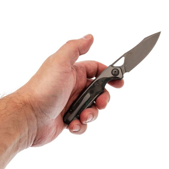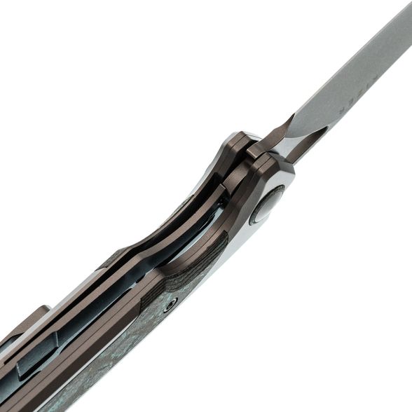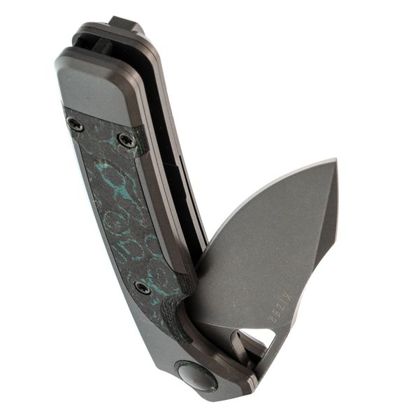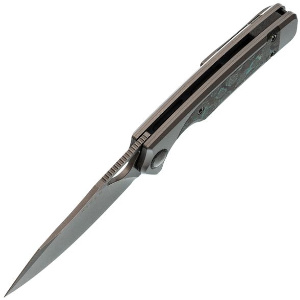 Титан с вставкой из черно-серого карбона: Титановая рукоять с вставкой из черно-серого карбона, украшенная зеленоватыми прожилками, добавляет не только прочности, но и утонченности. Этот материал придает ножу элегантность, а при этом сохраняет износостойкость и легкость.