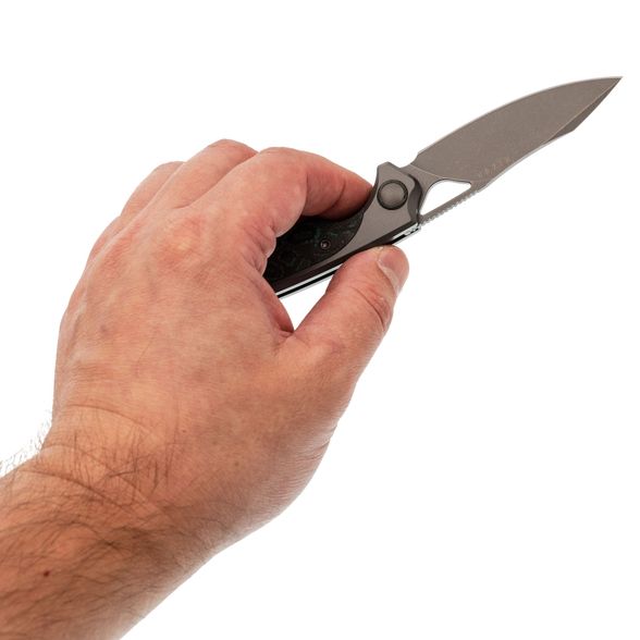 Рукоять, выполненная из титана, не только обеспечивает долговечность, но и идеально ложится в руку. Простая форма с небольшим изгибом и подпальцевой выемкой делают его использование удобным, а декоративная вставка из карбона с черно-серыми прожилками добавляет ножу глубину и утонченность.