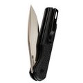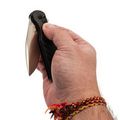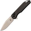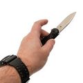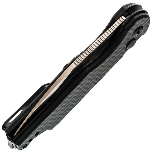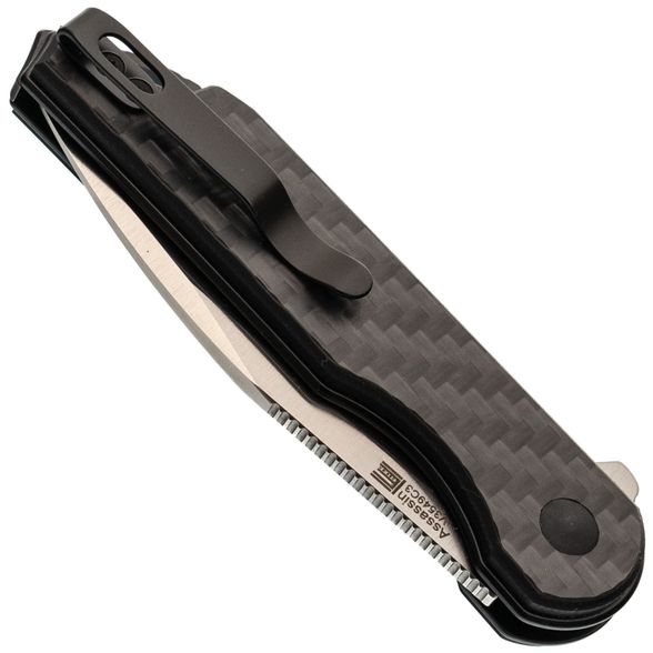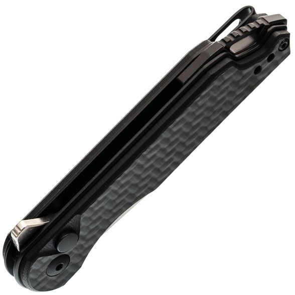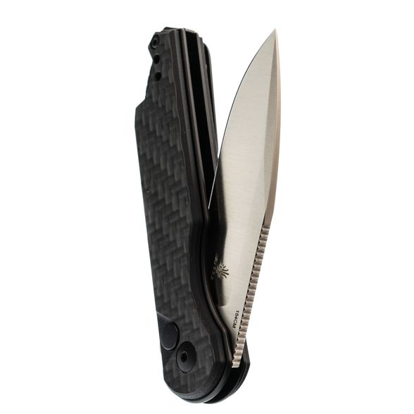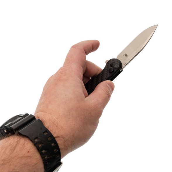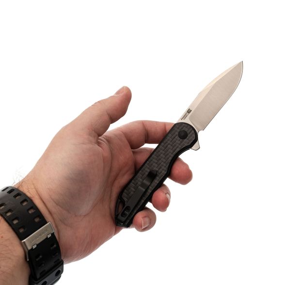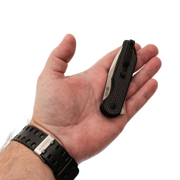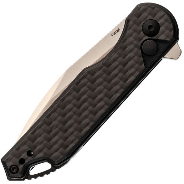Рукоять ножа представляет собой ламинат G10 и карбона, что обеспечивает прочность и удобство в использовании. Основа из G10 придаёт накладкам стабильности, а верхний слой карбона придаёт модели уникальный внешний вид. Плетение у карбона объёмное, и его можно ощутить руками, что добавляет рукояти немного цепкости. Замок Button-Lock прост в использовании: оперируется нажатием кнопки и позволяет быстро раскрыть нож взмахом руки. Такой механизм удобен как для правшей, так и для левшей. Клипса ножа глубокая и переставляемая, что позволяет удобно носить его в разных позициях.