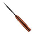 Оранжевая рукоять из G10 выделяется не только цветом, но и продуманной эргономикой. Цепкая текстура обеспечивает уверенное удержание даже в условиях повышенной влажности, а выраженный упор защищает руку от соскальзывания при активной работе. Конструкция рассчитана на длительное использование без дискомфорта, что особенно важно в туристических условиях.
