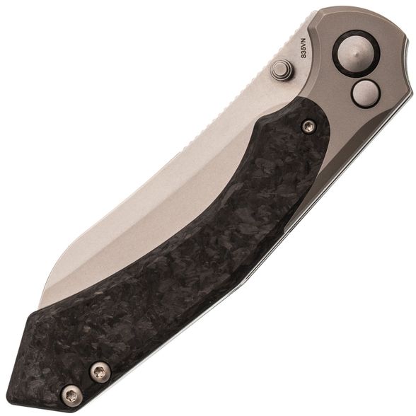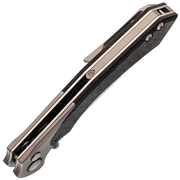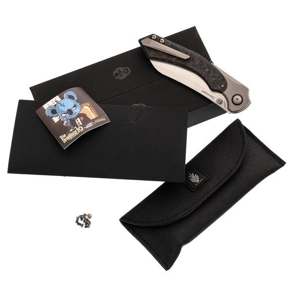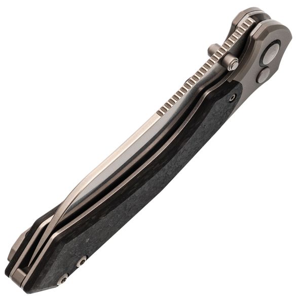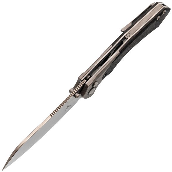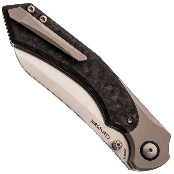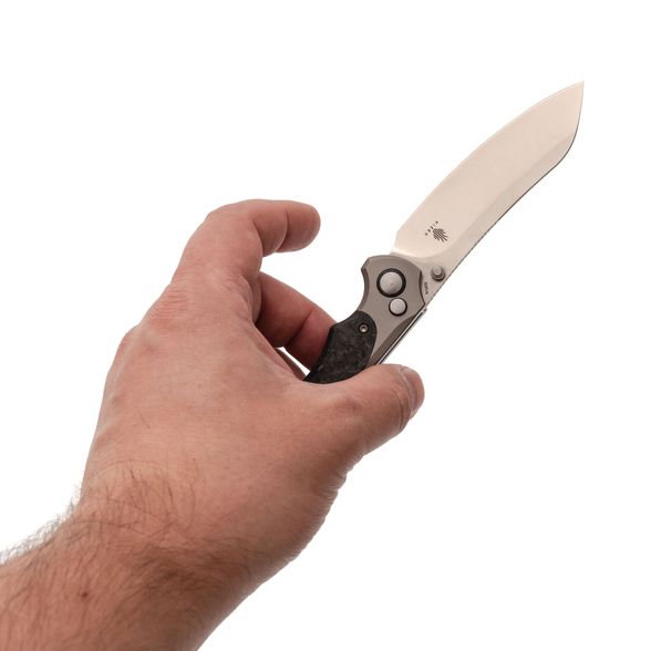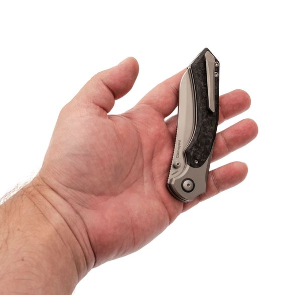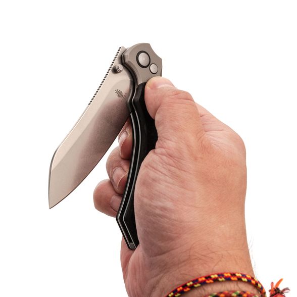 Рукоять ножа Kizer Clairvoyant — это сочетание премиальных материалов и эргономичного дизайна. Титановые больстеры и основа рукояти из карбона придают ножу не только эстетичный вид, но и обеспечивают легкость и прочность. Несмотря на свои размеры, нож не ощущается тяжелым благодаря низкому весу используемых материалов. Изогнутая форма рукояти с подпальцевой выемкой обеспечивает комфортный и надежный хват, подходящий для разных размеров рук и стилей хвата. Это позволяет использовать нож долгое время без усталости, что делает его отличным выбором для повседневного использования и активного отдыха.