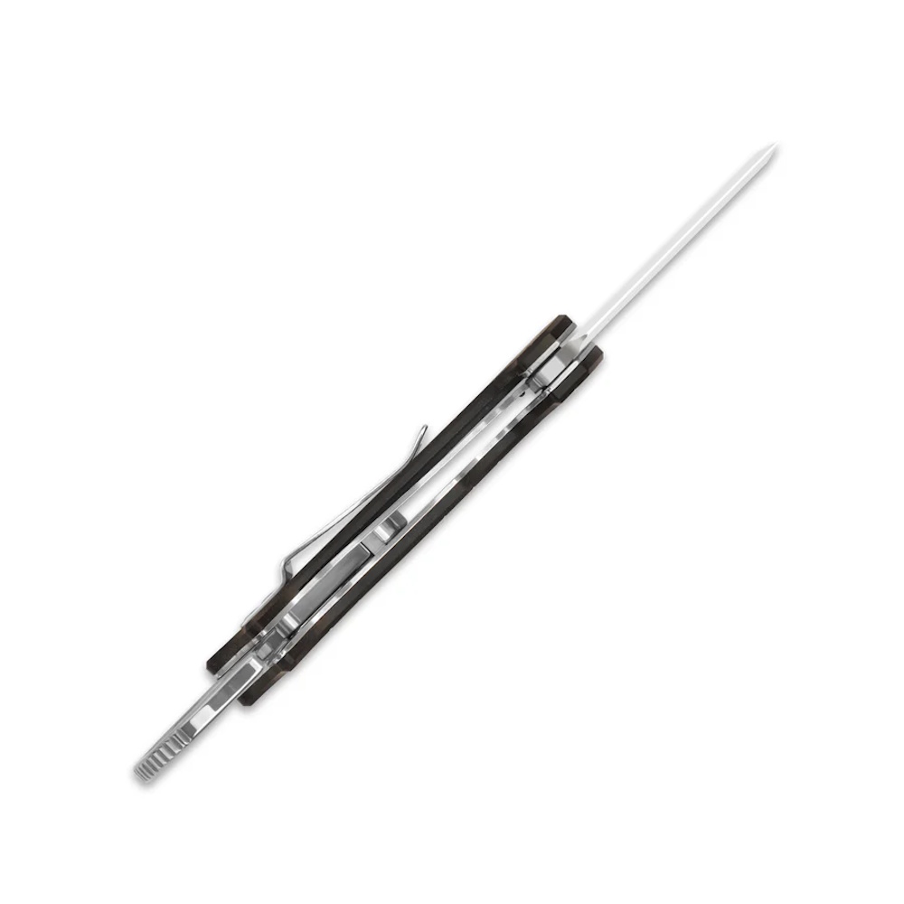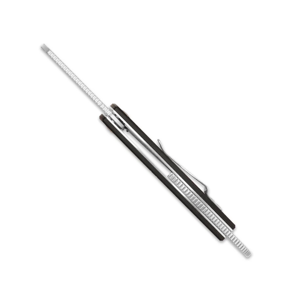 Рукоять из чёрного Richlite комфортна в хвате - материал тёплый на ощупь и уверенно сидит в ладони. На корпусе установлена клипса глубокой посадки, а кольцо на тыльной части служит дополнительной точкой опоры: оно упрощает контроль над инструментом при точных операциях и даёт дополнительную безопасность хвата без громоздких элементов. В целом Dodo сочетает аккуратный внешний вид с практичными решениями, которыми приятно пользоваться каждый день.