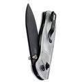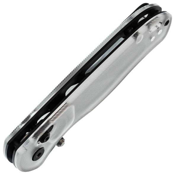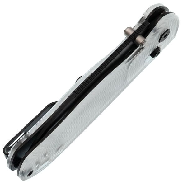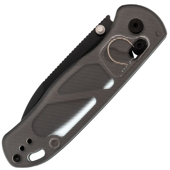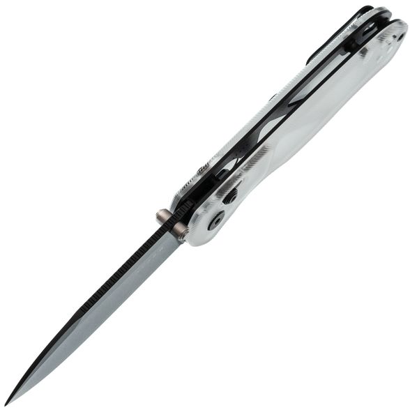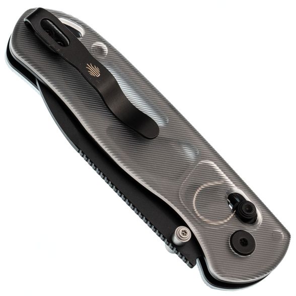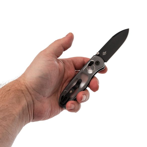 Рукоять изготовлена из Acrylic — легкого и прочного синтетического материала с цепкой текстурой, обеспечивающей надежное сцепление с рукой. Прозрачный темно-серый цвет придает ножу мрачное очарование, напоминая клубящийся туман в дождливую ночь. В конструкции используется замок Clutch-Lock, позволяющий легко открывать и закрывать нож инерционным способом. Еще одной интересной особенностью механизма является возможность регулировки натяжения пружин. Эргономичная форма рукояти обеспечивает удобство в использовании, а переставляемая клипса и дублируемые органы управления делают нож одинаково комфортным как для правшей, так и для левшей. Завершает образ темлячное отверстие, позволяющее персонализировать нож с помощью темляка.