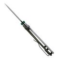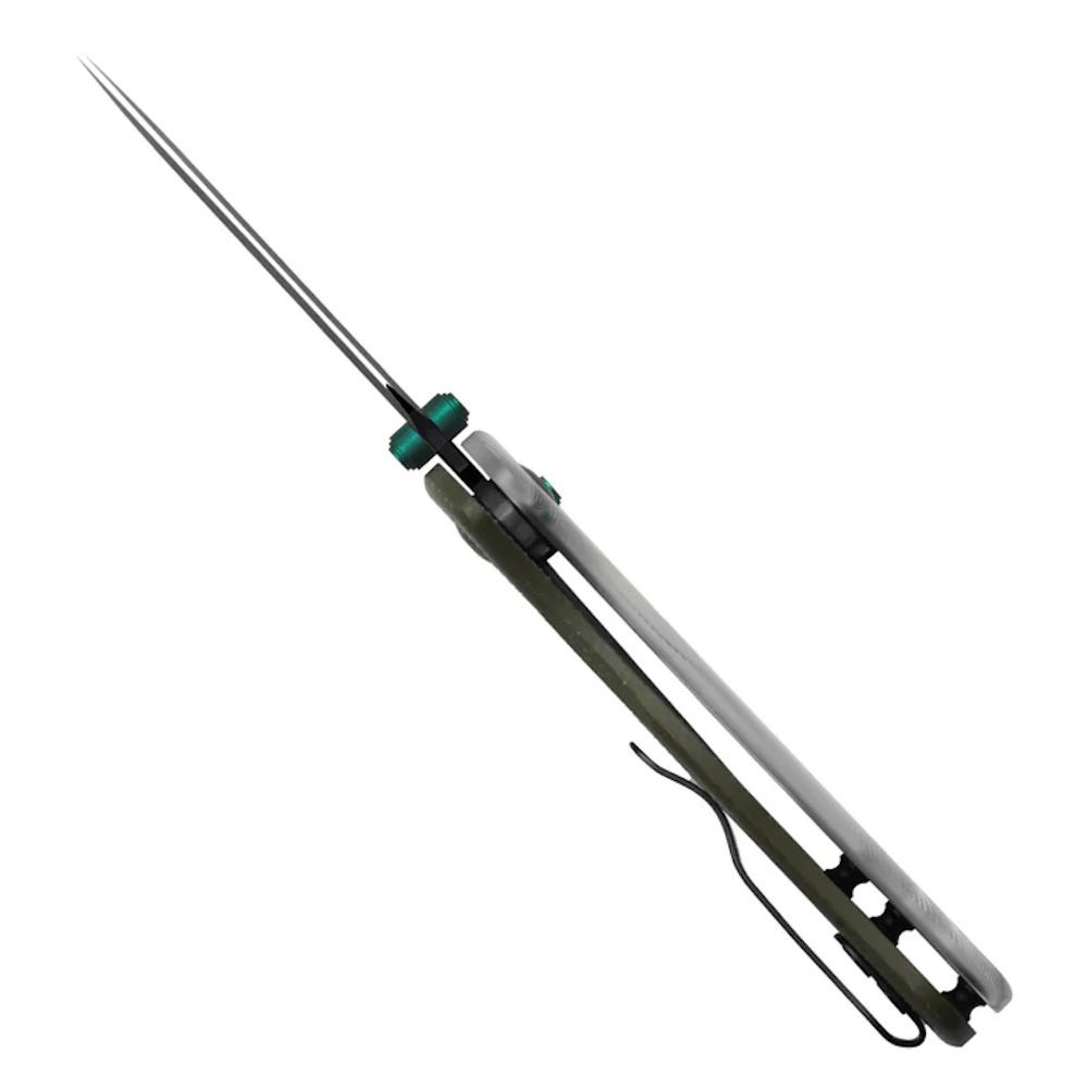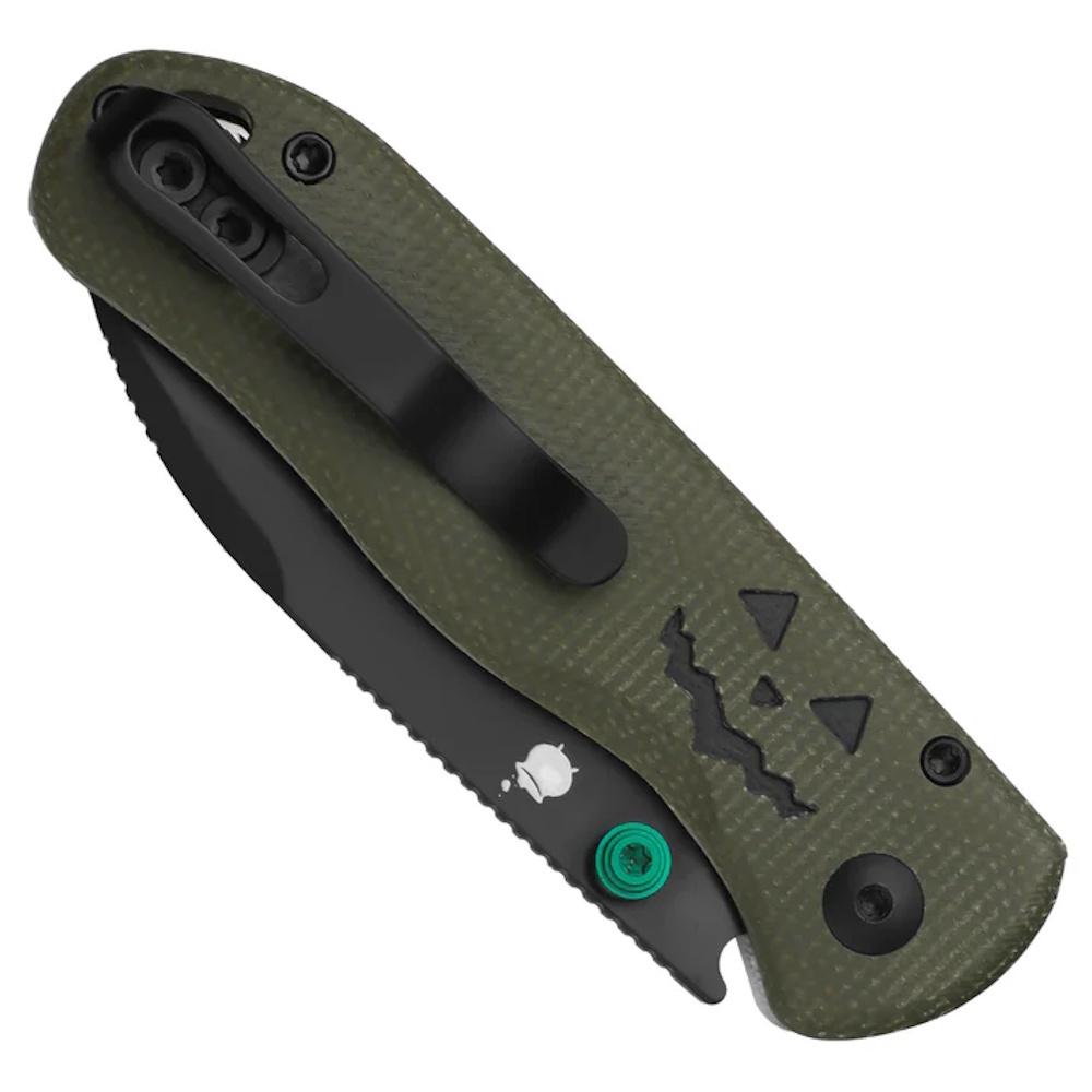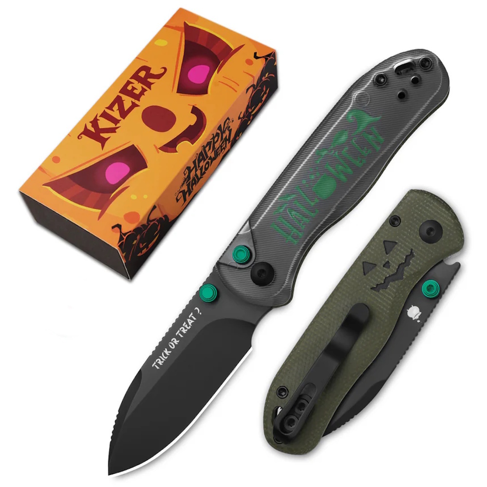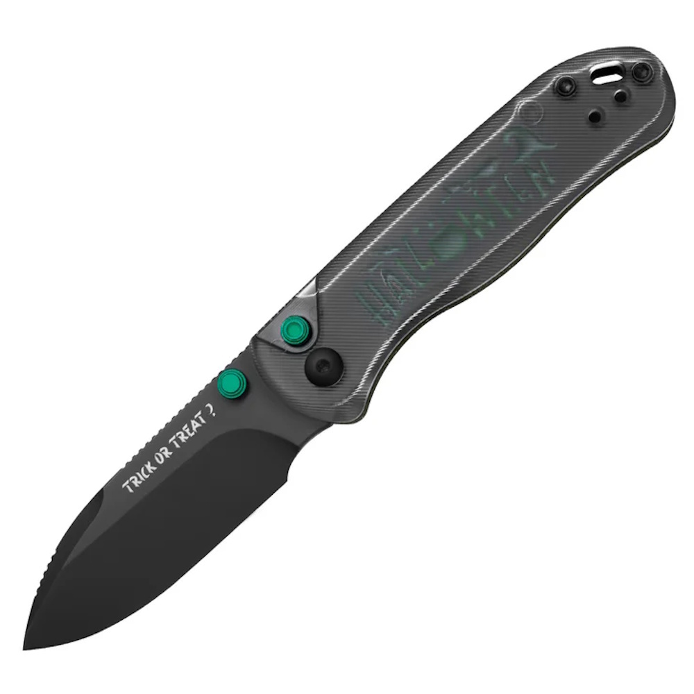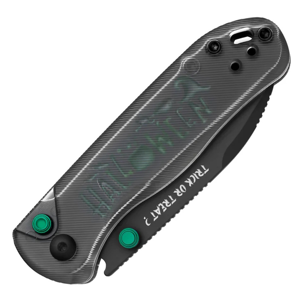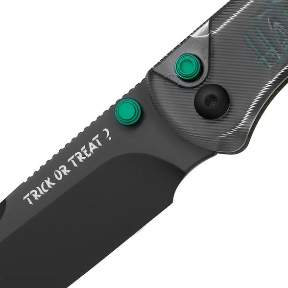 Рукоять - это настоящая душа данной модели. С одной стороны вас встречает узнаваемая улыбка, вырубленная в фактурной зеленой микарте. С другой - прозрачное окошко из акрила, за которым скрывается светящаяся надпись, создающая загадочное свечение в темноте. Изумрудный шпенек и кнопка фиксатора добавляют яркий акцент, завершая этот неповторимый хеллоуинский образ.