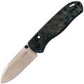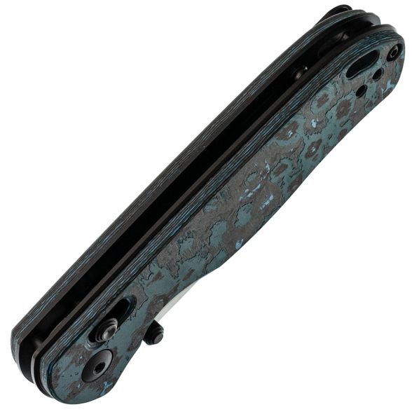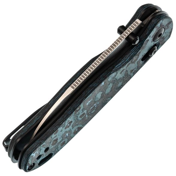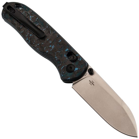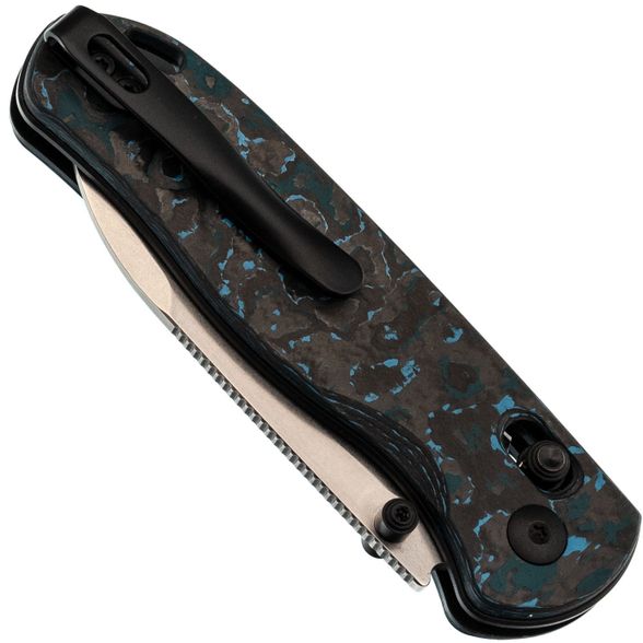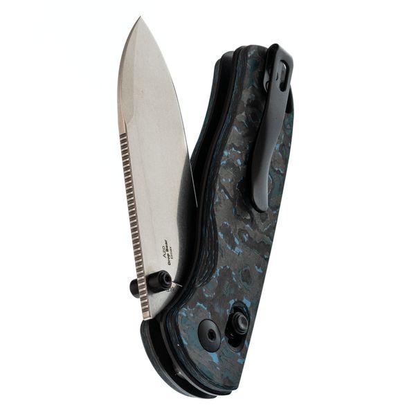 Рукоять выполнена из карбона, произведённого компанией Fatcarbon — одного из лидеров в производстве композитных материалов премиум-класса. Этот карбон отличается высокой прочностью, лёгким весом и полной устойчивостью к влаге, а также обладает выразительной эстетикой. Хаотичное смешение цветов в материале делает каждую рукоятку уникальной, поэтому ни один экземпляр Drop Bear не будет полностью повторять другой. Такая особенность особенно ценится коллекционерами и любителями индивидуальности в инструментах. Внутри рукояти установлены облегчённые стальные лайнеры, обеспечивающие дополнительную прочность конструкции. В качестве замка используется фирменный Clutch-Lock — модифицированная и доработанная версия Axis-Lock, позволяющая регулировать натяжение пружин, настраивая силу удержания клинка и усилие открывания под личные предпочтения. Также нож оснащён переставляемой клипсой глубокой посадки, которая позволяет удобно и незаметно носить его в кармане как на правой, так и на левой стороне. Всё вместе делает Drop Bear не просто стильным, но и крайне удобным и надёжным инструментом на каждый день.