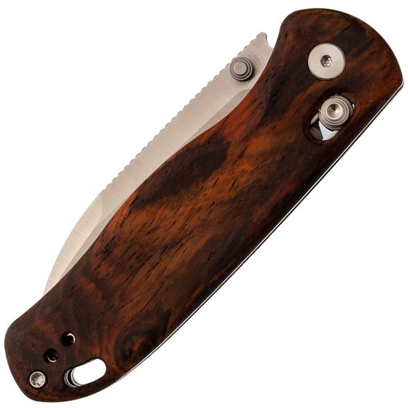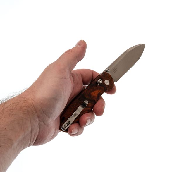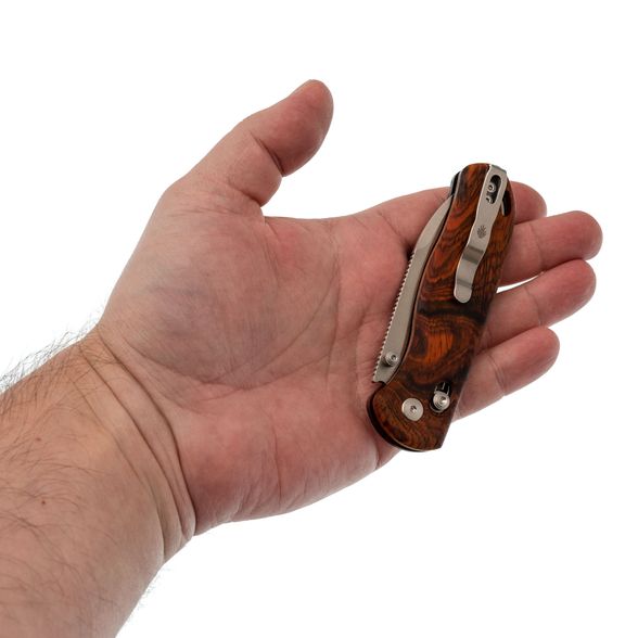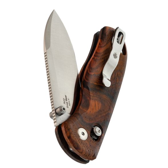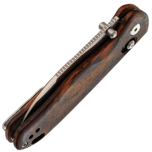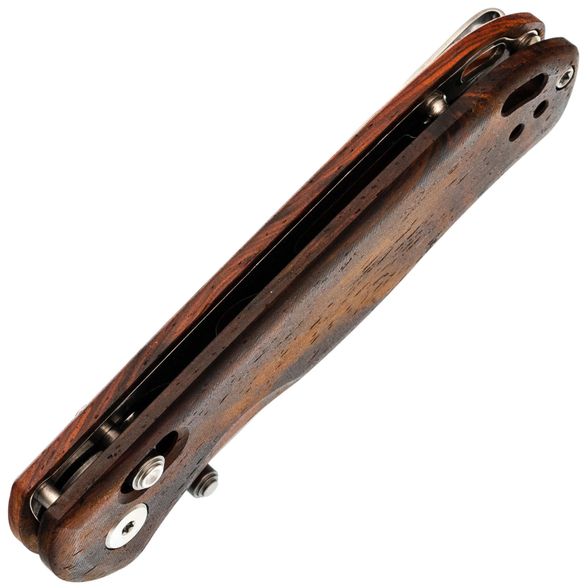 Рукоять претерпела значительные изменения в данном исполнении. Стальные лайнеры спрятаны под накладки из розового дерева (палисандра), что придает ножу более изящный и тонкий вид, облегчая ношение в кармане. Использование древесины придает ножу классический и элегантный внешний вид. Фирменный замок Clutch-Lock симметричен и удобен как для правшей, так и для левшей, а также позволяет регулировать жесткость. Под накладками расположены пружины и пять отверстий для точной настройки натяжения. Клипса глубокого ношения может быть переставлена на другую сторону, обеспечивая комфорт для всех пользователей.