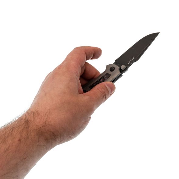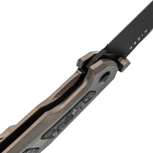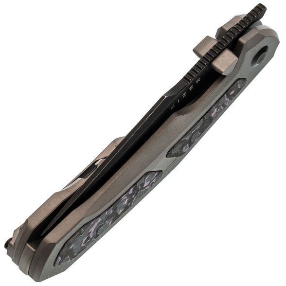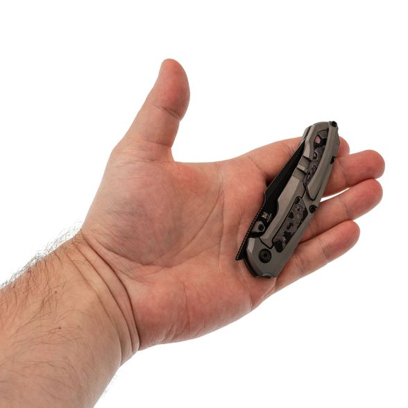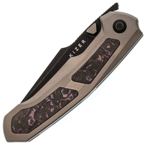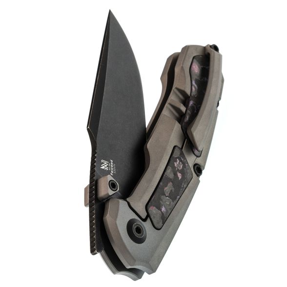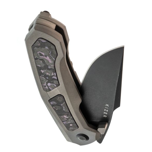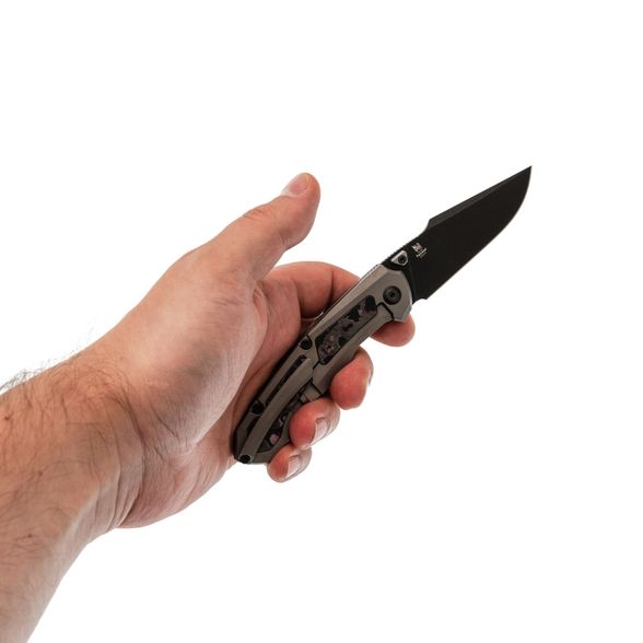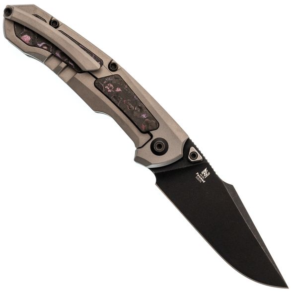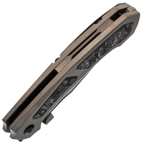 Рукоять выполнена из титана, что делает её лёгкой и прочной. В данной версии вставка из карбона "Фиолетовый туман" — черно-серый карбон с фиолетовыми прожилками, создающий эффект загадочности. Карбон не только красив, но и отличается высокой прочностью и лёгкостью. Эргономичная изогнутая форма рукояти обеспечивает надёжный и удобный хват. Надёжный замок Frame-Lock гарантирует безопасность при использовании, а титановая цельнофрезерованная клипса и бонка позволяют закрепить темляк, делая нож ещё более удобным в повседневном ношении.