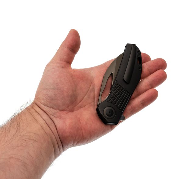Рукоять, созданная из титана, обеспечивает идеальное соотношение прочности и легкости. Титановый сплав гарантирует долговечность и надежность, позволяя ножу выдерживать высокие нагрузки. Мелкая насечка на рукояти обеспечивает надежный хват, даже в сложных условиях. Скрытый замок Liner-Lock, расположенный под накладками, надежно фиксирует клинок, сохраняя целостность дизайна. Изогнутая форма рукояти обеспечивает максимальный комфорт и эргономику, делая использование ножа удобным и безопасным. Титановая клипса, изготовленная методом фрезерования, и крупное темлячное отверстие дополняют функциональность ножа, позволяя легко носить его и прикреплять различные аксессуары. Kizer Hawk - это нож, который сочетает в себе высокое качество, уникальный дизайн и практичность, удовлетворяя требования самых взыскательных пользователей.