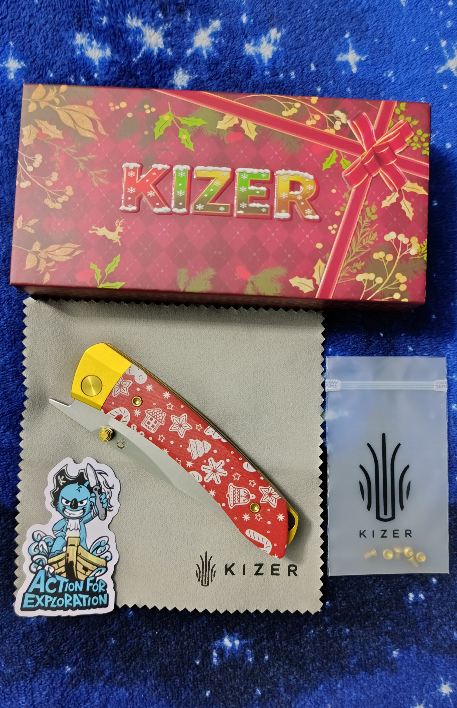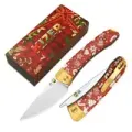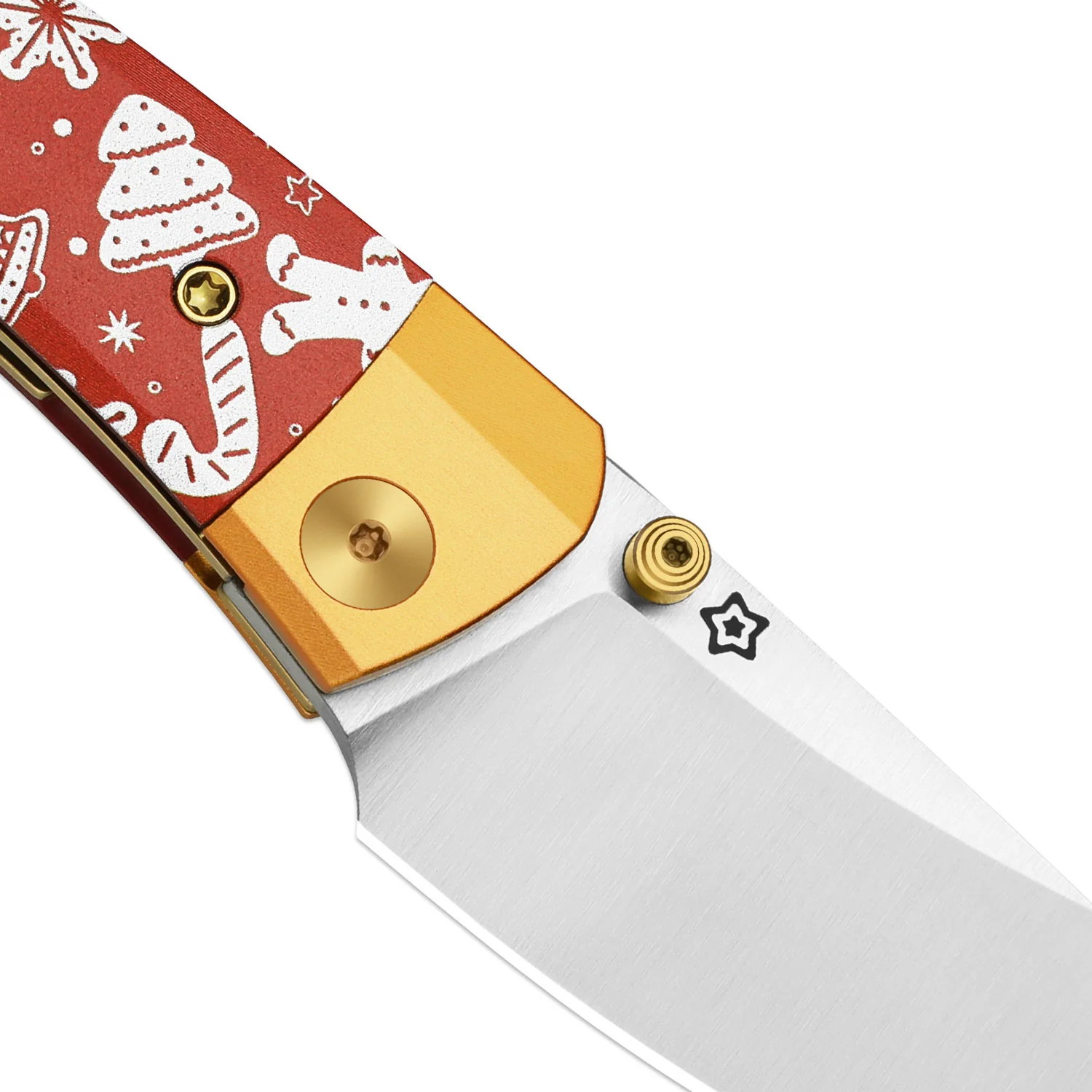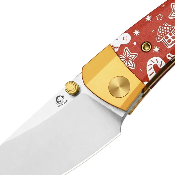 Плавный изгиб рукояти позволяет использовать разные хваты без ограничений. Замок Liner-Lock фиксирует клинок стабильно, клипса помогает носить нож ежедневно, а крупное отверстие под темляк добавляет практичности. Орнамент с ёлочками, снежинками, леденцами, пряничными домиками и колокольчиками создаёт цельный праздничный рисунок.