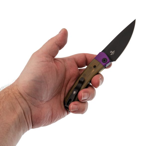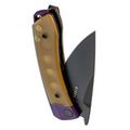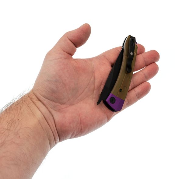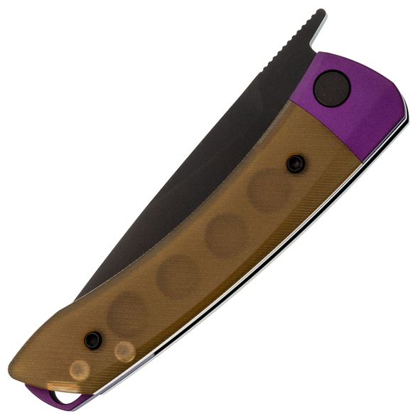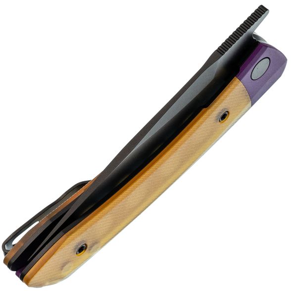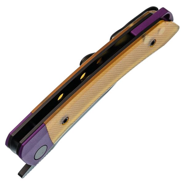 Рукоять ножа выполнена из комбинированных накладок: фиолетовый больстер из алюминия сочетается с ярким желтым термопластиком PEI (Ultem), что создает яркий и необычный облик. Такой выбор материалов обеспечивает прочность и легкость конструкции. Благодаря нейтральной форме рукоять удобно лежит в руке, а надежный замок Liner-Lock гарантирует безопасность при использовании. Дополнительное удобство добавляют клипса для кармана и крупное отверстие под темляк.