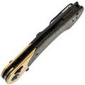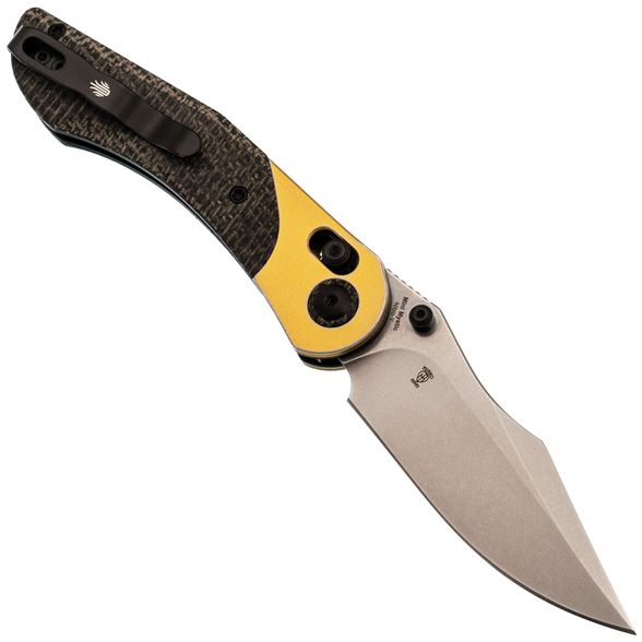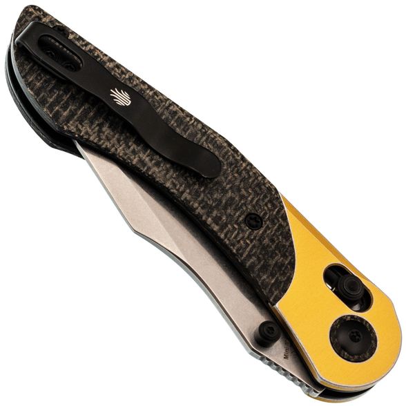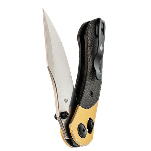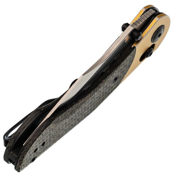Рукоять состоит из стальных лайнеров с накладками из алюминия и черной микарты, что обеспечивает рукояти прочность, малый вес и неприхотливость, а также создает винтажный эффект. Эргономичная изогнутая форма удобно ложится в руку. Модель оснащена замком Clutch-Lock, который позволяет инерционно открывать и закрывать клинок, а также регулируется по степени тугости. Дополнительно предусмотрены переставляемая клипса и темлячная бонка для удобства ношения.