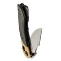 Клинок изготовлен из нержавеющей стали Nitro-V, обладающей высокой твердостью, прочностью и устойчивостью к коррозии. Эта сталь позволяет затачивать клинок на малые углы, обеспечивая остроту режущей кромки. Профиль клинка — Clip-Point с гарпуном, что не только придает ему агрессивный вид, но и делает удобным для реза и проколов. Высокие спуски улучшают режущие свойства, что делает нож эффективным в повседневных задачах.