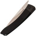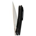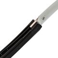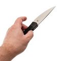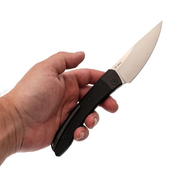 Клинок достаточно крупный и изготовлен из стали 154CM, что обеспечивает идеальный баланс между удержанием заточки и сопротивлением коррозии, а также имеет черный цвет, что делает его еще более привлекательным. Форма клинка притягивает взгляды и имеет необычную, но очень эффективную режущую геометрию, которая идеально подходит для метательных лезвий. Прямые спуски и большая ширина делают его превосходным резаком. Кончик клинка деликатный, что обеспечивает высокую проникающую способность, но очень хорошо для силового ковыряния.