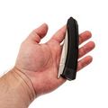 Рукоять изготовлена из прочного и легкого алюминия, что делает нож солидным на вид, но легким в руке, а также имеет черный цвет, что добавляет ему дополнительный стиль. Изогнутая форма обеспечивает естественное и комфортное удерживание, благодаря чему её не хочется выпускать из руки. Что бы замок Liner-Lock было удобнее закрывать, на втором стальном лайнере есть выборка, что говорит высочайшем внимании к деталям. Этот нож - идеальный выбор для тех, кто ценит уникальный дизайн, функциональность и удобство в одном инструменте, а также предоставляет информацию о системах флиппера, что делает его еще более привлекательным для покупки.
