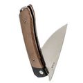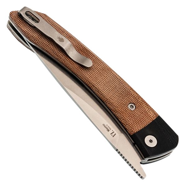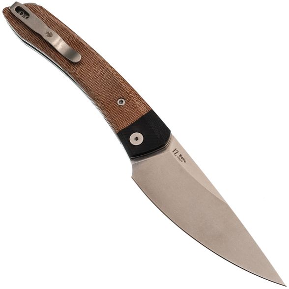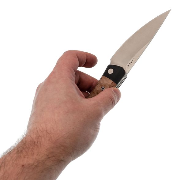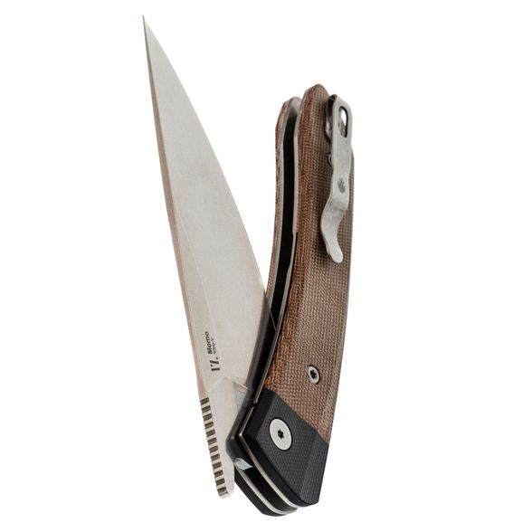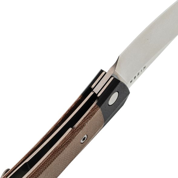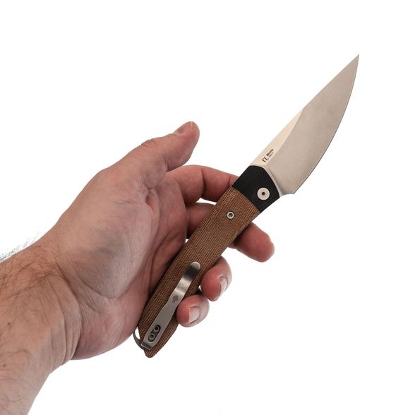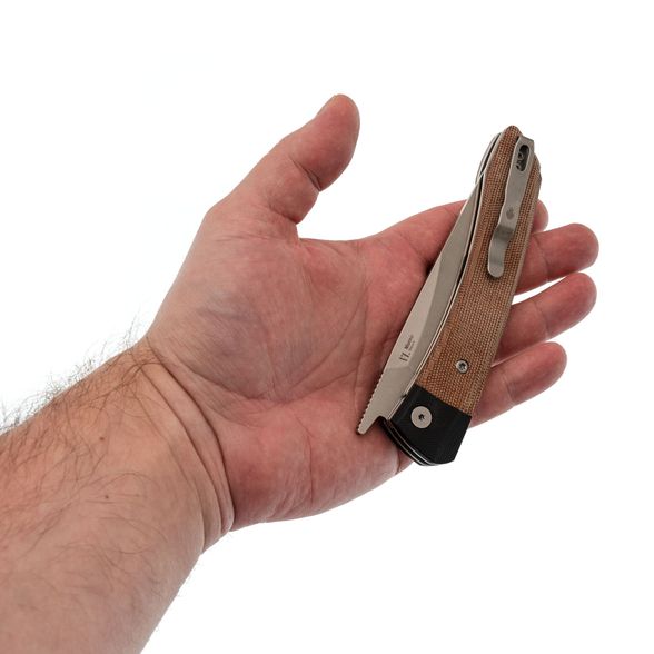 Рукоять ножа изготовлена из микарты коричневого цвета, что создает ощущение натурального дерева и добавляет изделию винтажного шарма. Изогнутая форма обеспечивает комфортное и надежное удержание, дополненную карманной клипсой, крупным темлячным отверстием и замком Liner-Lock, который гарантирует безопасность при ежедневном использовании.