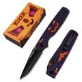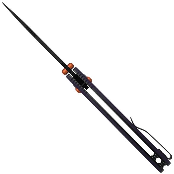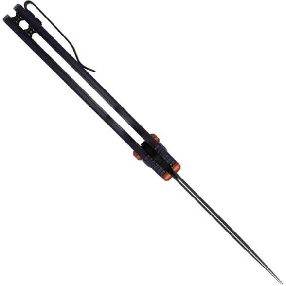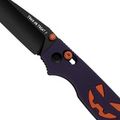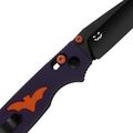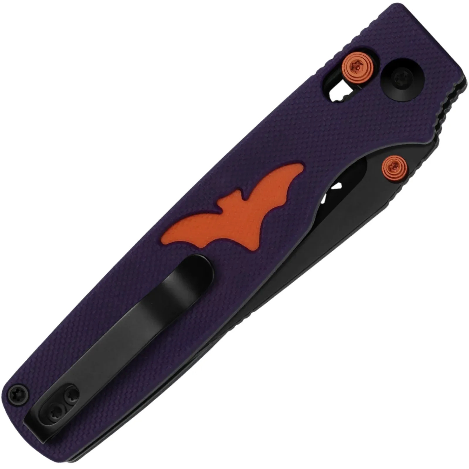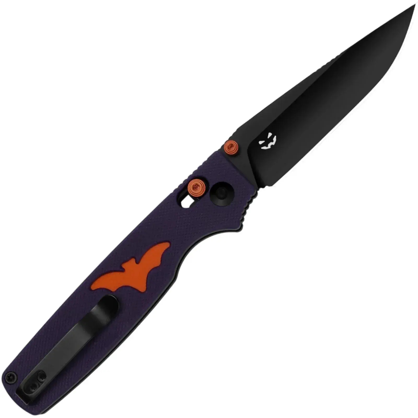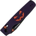 Рукоять - это настоящая кульминация дизайнерской задумки. Фиолетовый цвет символизирует мистику и таинственность, а контрастные оранжевые элементы - праздничное веселье. Метод вырубки позволил создать на накладках из G10 четкие и долговечные изображения: с одной стороны - летучая мышь, символ ночи, а с другой - озорная улыбка. Оранжевые шпенек и кнопка замка Clutch Lock не только добавляют удобства при использовании, но и завершают этот яркий, запоминающийся облик.