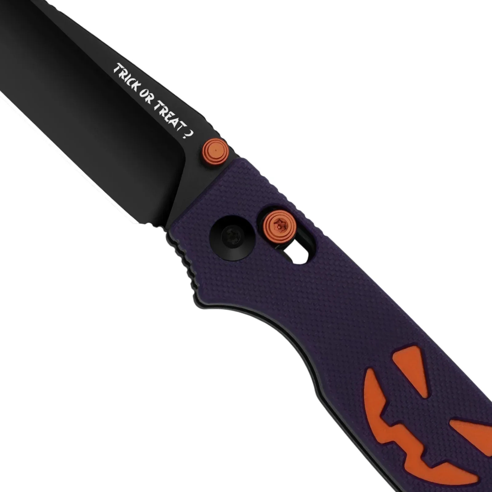 Форма Modified Drop Point делает этот клинок универсальным помощником, а вогнутые спуски обеспечивают превосходные режущие качества. Однако главной изюминкой становится тематическое оформление. На матовом черном фоне с одной стороны белая гравировка в виде забавной рожицы, а с другой нанесен знаменитый вопрос "Trick or treat?", который сразу настраивает на праздничный лад.