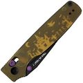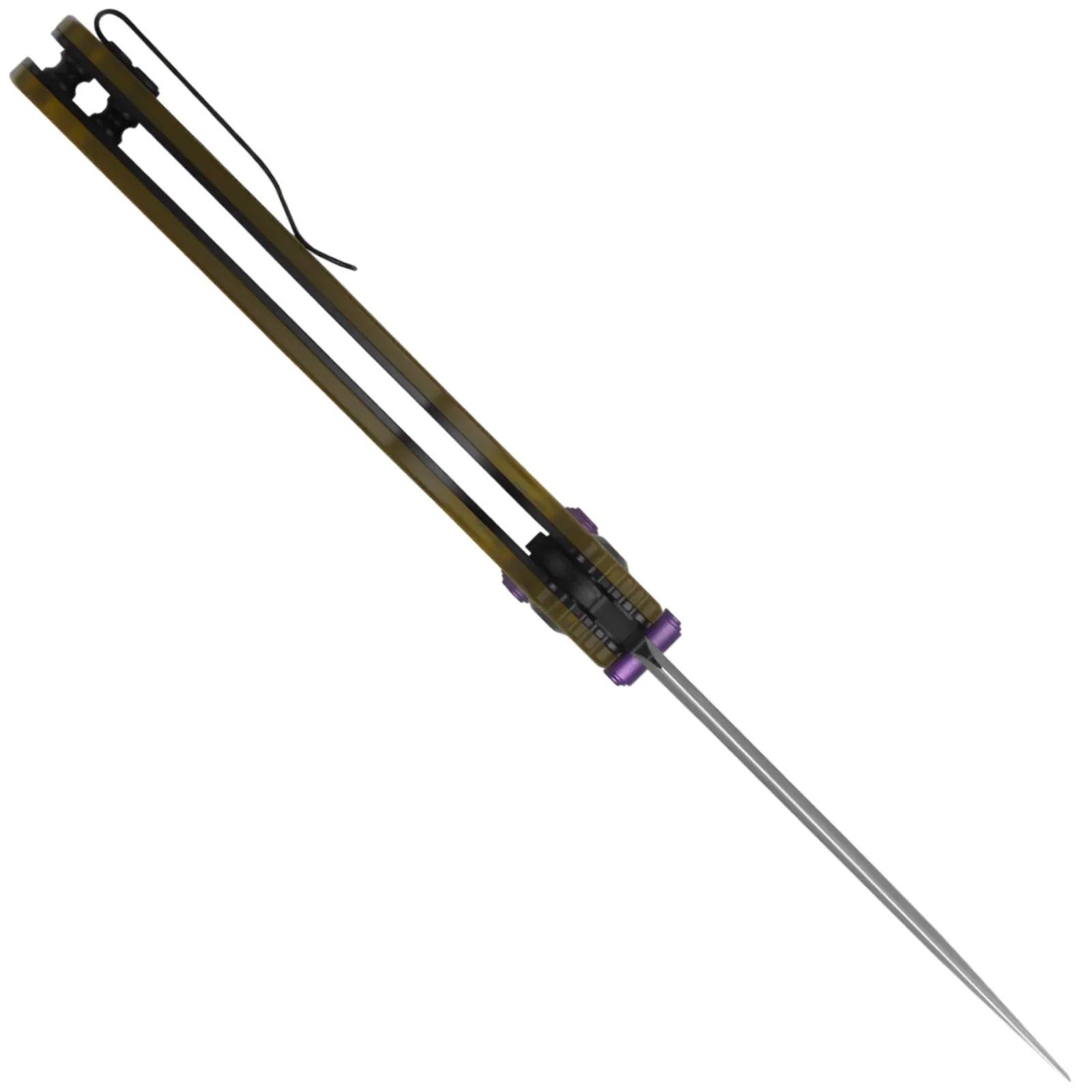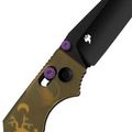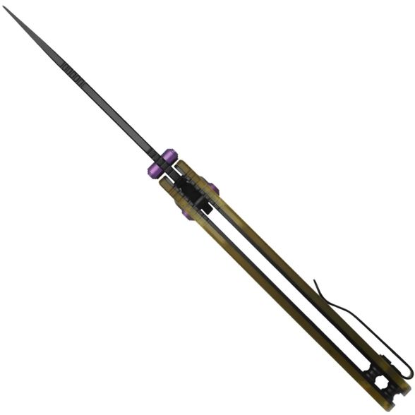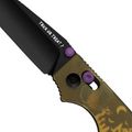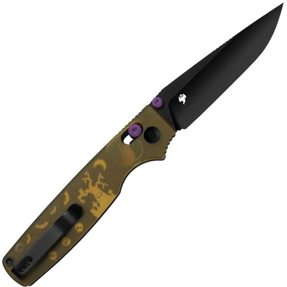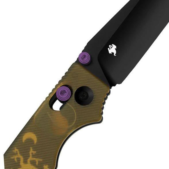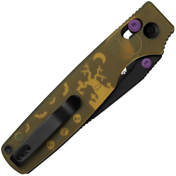Рукоять - это отдельная история. Благодаря материалу PEI, уникальный дизайн с желтым рисунком виден насквозь. Механизм открывания приводится в действие с помощью шпенька, который, как и кнопка замка, выполнен в насыщенном фиолетовом цвете. Эта яркая деталь эффектно контрастирует с общим темным тоном и подчеркивает праздничную тематику. Замок типа Clutch Lock гарантирует безопасную и уверенную фиксацию в открытом положении.