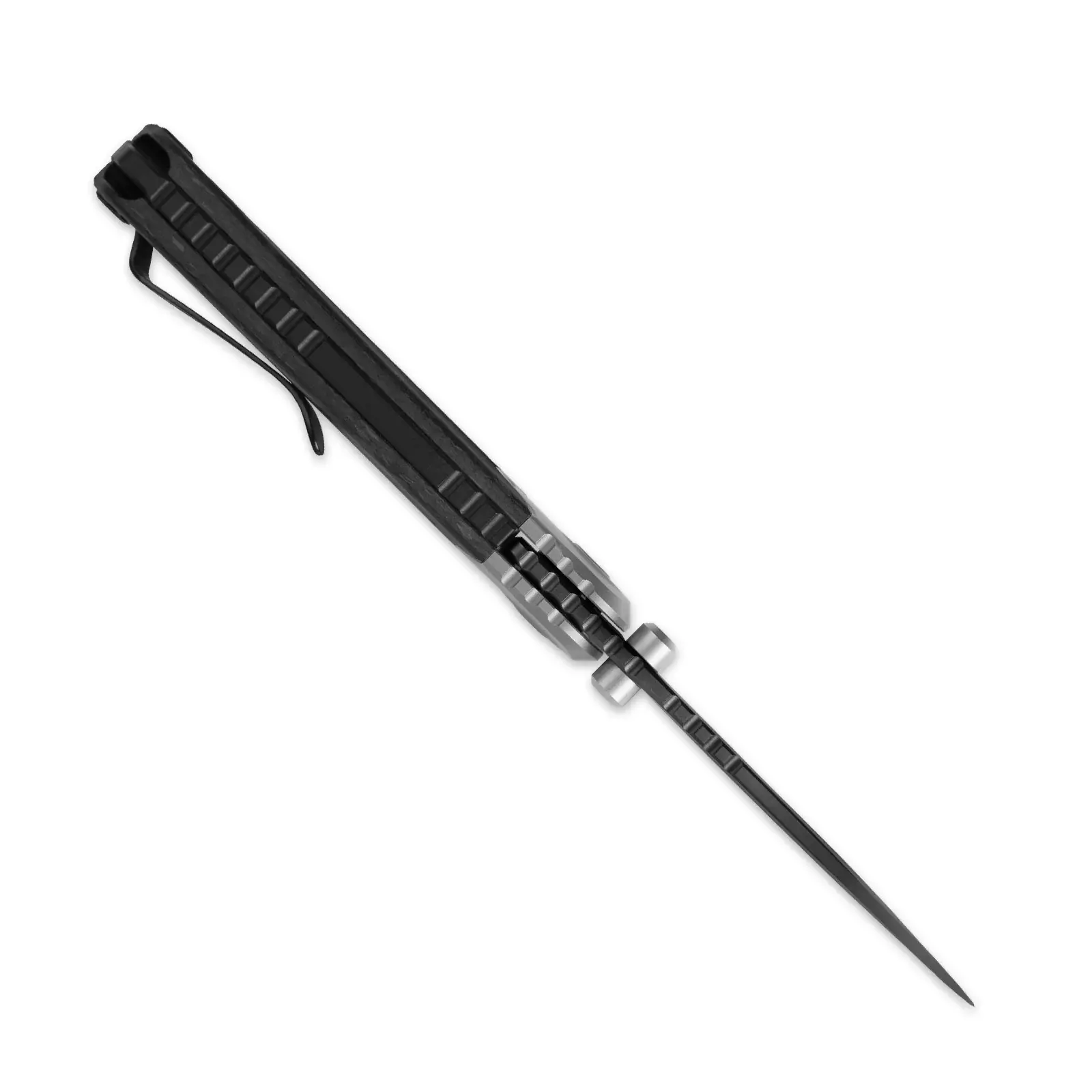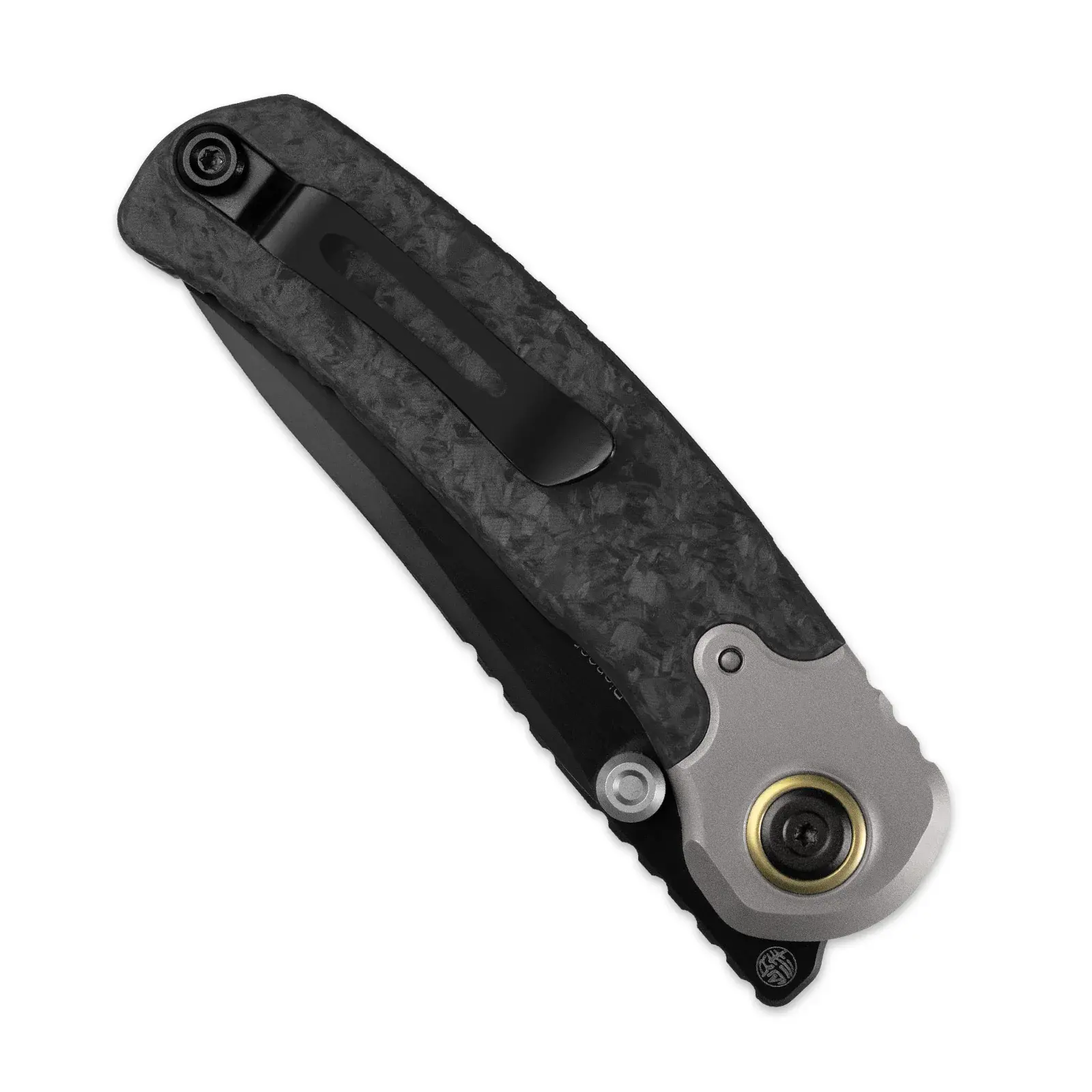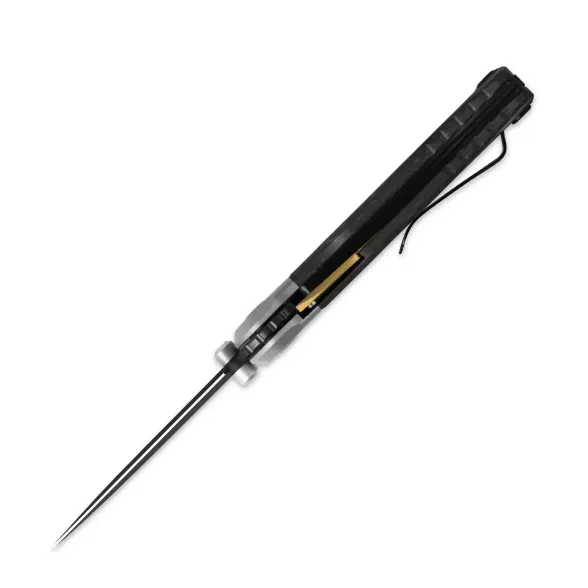 Рукоять у Pioneer плавно изогнутая, ладонь садится естественно, без лишних "ломаных" форм. Титановый больстер задаёт строгий, чуть "винтажный" настрой, а карбоновые накладки добавляют современный характер и цепкий хват. Разделение на больстер и накладки как раз и напоминает о классических складнях прошлых эпох, но с современной подачей. Для повседневного ношения нож оснащён аккуратной карманной клипсой: Pioneer спокойно исчезает в кармане, не мешая в течение дня, и так же спокойно возвращается в руку, когда он нужен.