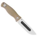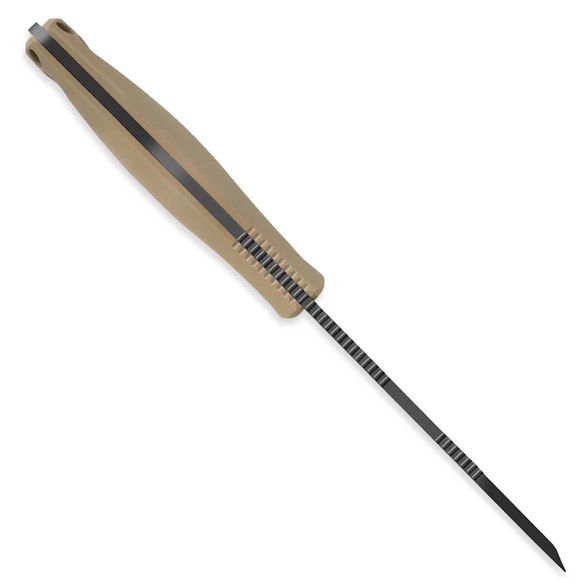 Рукоять этого инструмента разработана с учетом удобства в долгосрочном использовании. Она выполнена из G10, обеспечивающего надежный хват, и имеет слегка изогнутую форму, которая хорошо заполняет руку, минимизируя усталость. Цельнометаллический монтаж увеличивает прочность конструкции, а выступающая часть хвостовика позволяет использовать нож для дробящих ударов, если это потребуется.