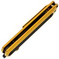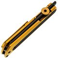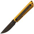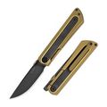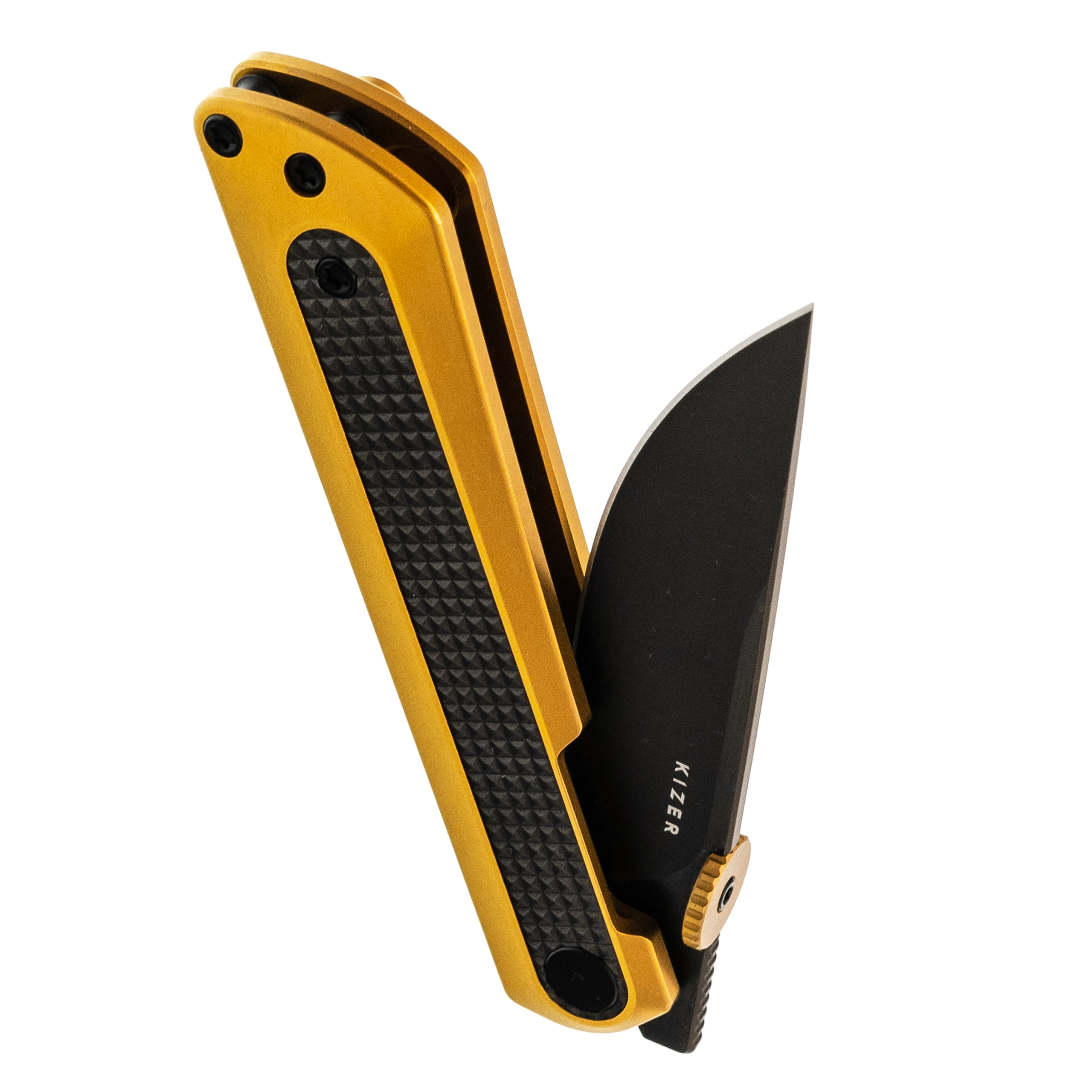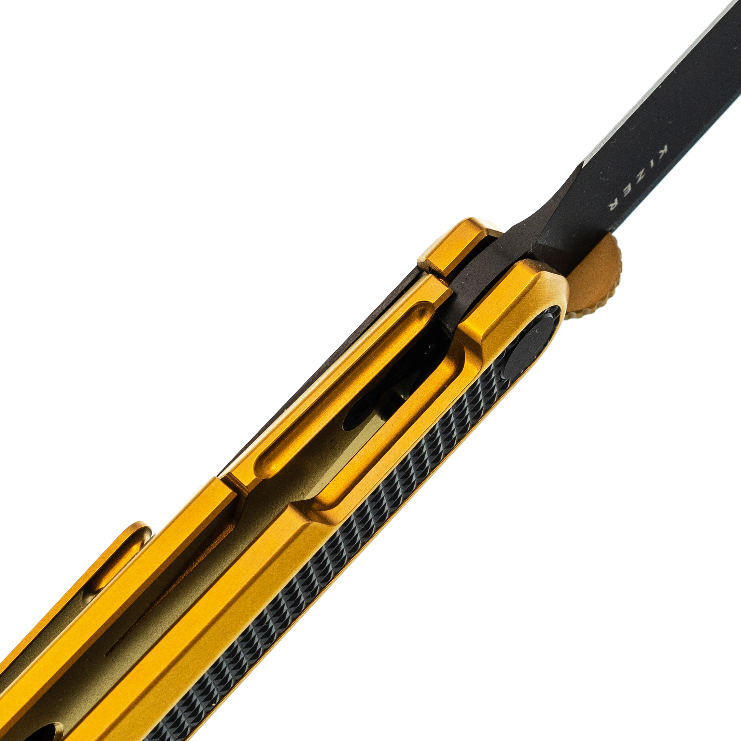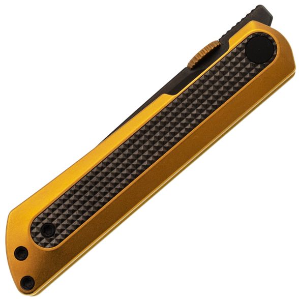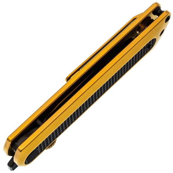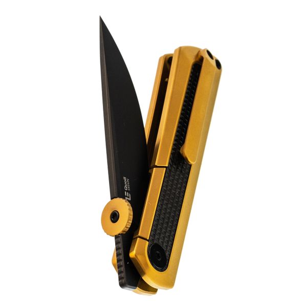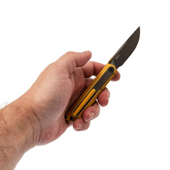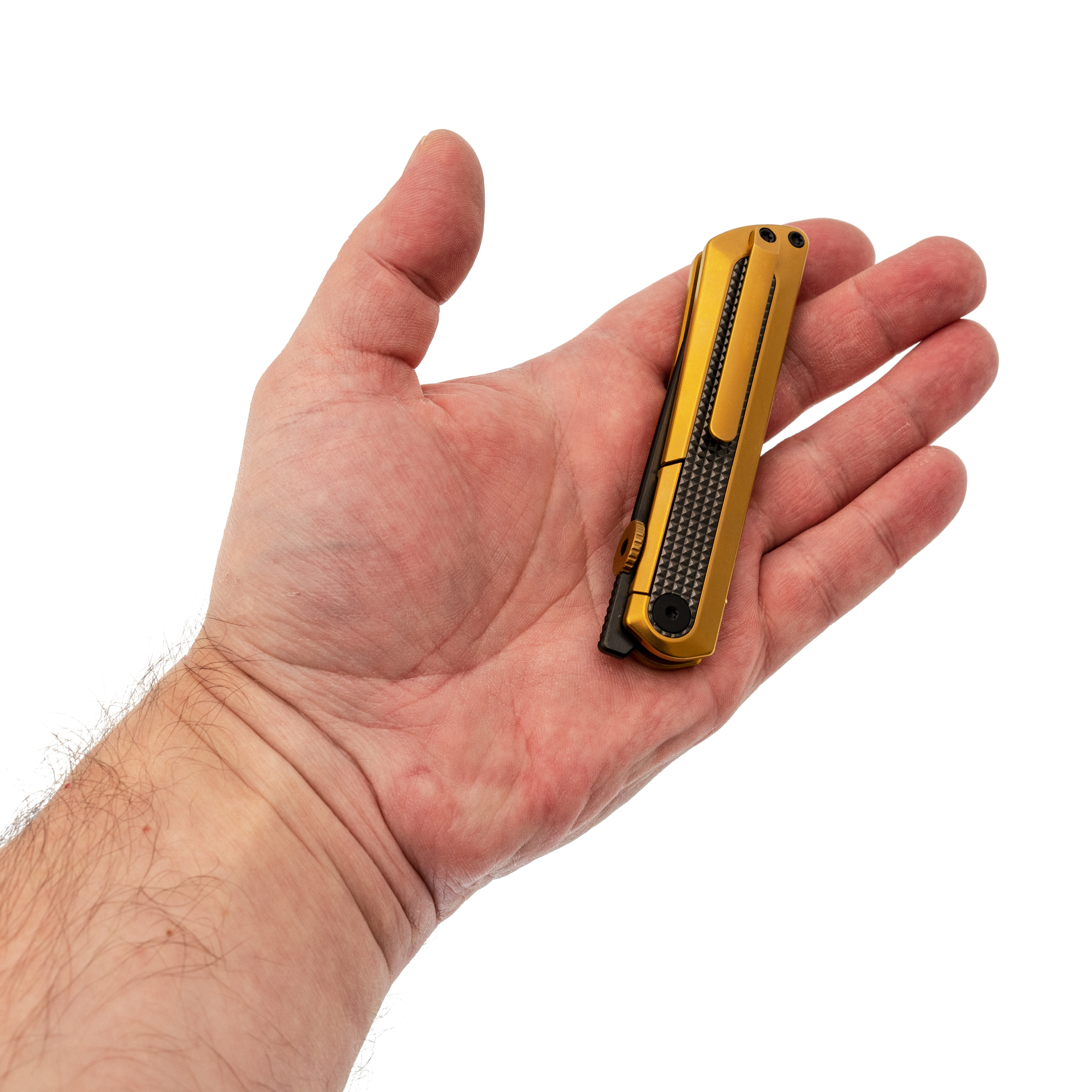 Золотистая титановая рукоять приятно лежит в руке, обеспечивая уверенный хват. Для приведения в рабочее состояние используется удобный диск на обухе, с которым легко взаимодействовать одним пальцем. Проверенный механизм фиксации (frame-lock) гарантирует безопасную работу, надёжно удерживая клинок в раскрытом положении.