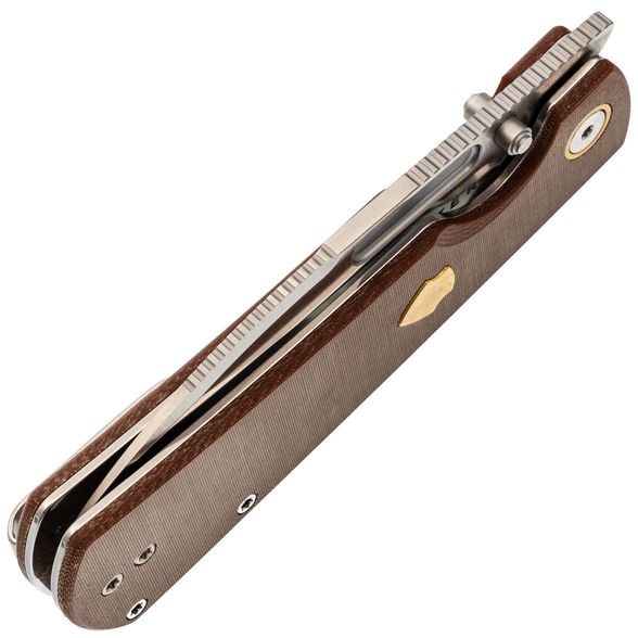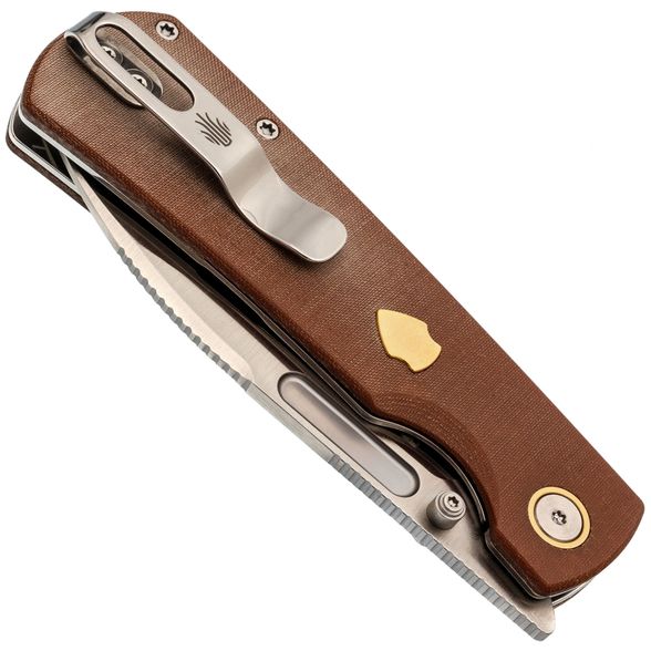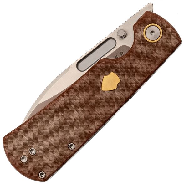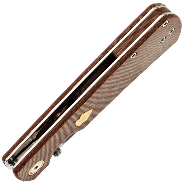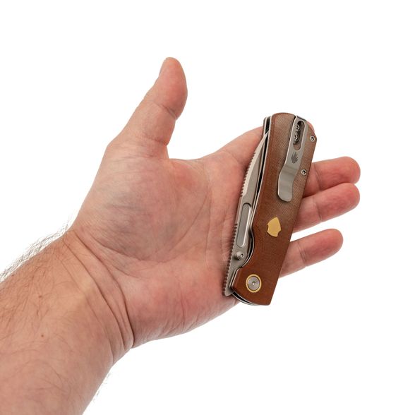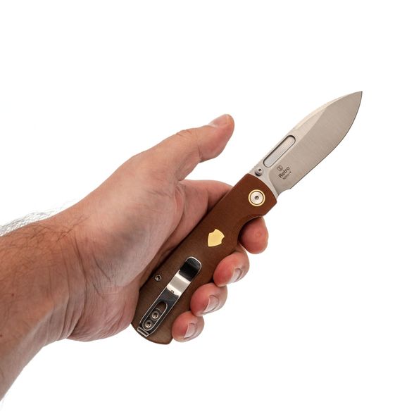 Контуры рукояти повторяют традиционные очертания старинных складных ножей, однако современные улучшения не остались в стороне: подпальцевая выемка существенно повышает эргономику и удобство хвата. Эстетика дополняется латунной вставкой в виде щита - яркая отсылка к историческим моделям. Удобная карманная клипса и надёжный замок Liner-Lock подчеркивают современный функционал, не нарушая общей гармонии классики и инноваций.