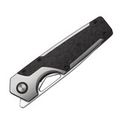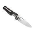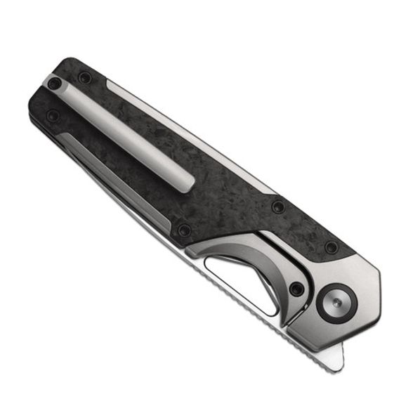 Рукоять сочетает титановые элементы и карбоновые накладки чёрного цвета, создавая современный и функциональный дизайн. Эргономичная форма обеспечивает уверенный и цепкий хват, позволяя инструменту комфортно лежать в руке даже при длительном использовании. Замок Frame Lock гарантирует стабильность фиксации клинка и уверенность в работе.