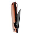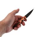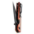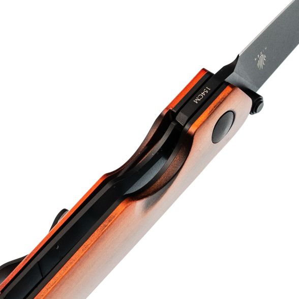 Клинок изготовлен из стали 154CM, которая относится к проверенным нержавеющим сталям среднего ценового сегмента. Этот материал широко известен своим отличным балансом свойств: он обеспечивает высокую коррозионную стойкость и долго сохраняет остроту рабочей кромки, что делает его универсальным выбором для EDC-ножей. На клинок нанесено черное защитное покрытие, которое не только повышает стойкость к ржавчине, но и идеально сочетается с общим стилем ножа. Геометрия клинка выполнена в универсальном профиле Drop-Point с прямыми спусками от тонкого обуха. Благодаря этой конструкции нож легко справляется с резом и проколом, что делает его удобным инструментом для самых разных задач.
