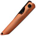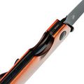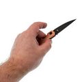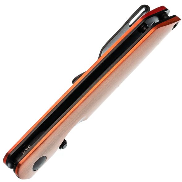 Рукоять ножа выполнена из алюминиевого сплава, что обеспечивает лёгкость конструкции и её стабильность при эксплуатации. Алюминий имеет покрытие цвета меди, которое придаёт рукояти дополнительный винтажный эффект, усиливающий её эстетическую привлекательность. Производитель добился уникальной текстуры, которая создаёт ощущение лёгкой потертости и добавляет ножу характер. Замок Liner-Lock подходит для компактных размеров ножа и обеспечивает надёжную фиксацию клинка при повседневных задачах. Несмотря на то, что для грубых работ этот замок не предназначен, его прочности достаточно для большинства сценариев использования. Подшипниковый осевой механизм и качественный детент обеспечивают мягкое и плавное открытие ножа, что делает его использование ещё более комфортным.